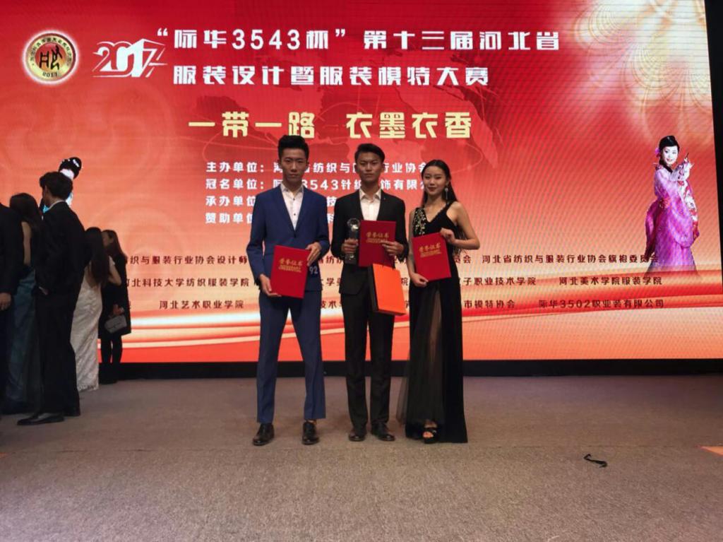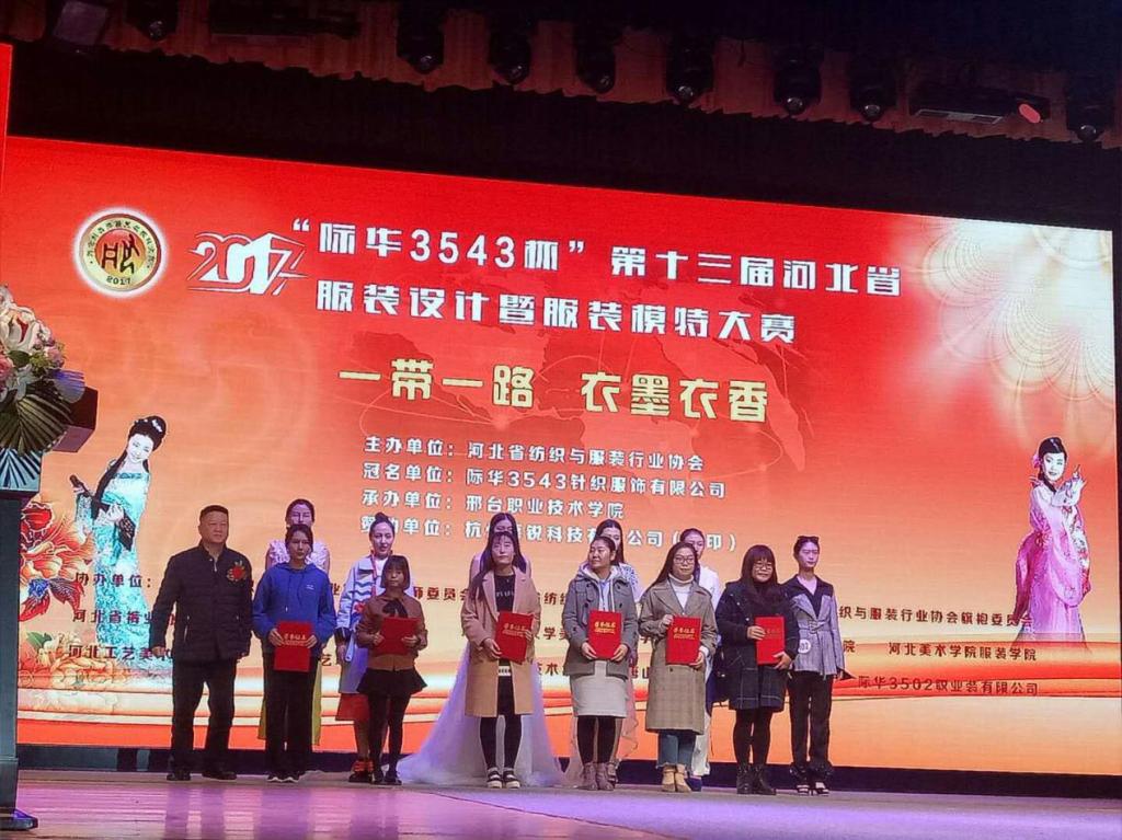 2017年10月27日-10月29日,以“一带一路,衣墨衣香”为主题的“际华3543杯”第十三届河北省服装设计暨服装模特大赛在河北省邢台市邢台职业技术学院顺利展开。我校32名师生参赛,其中参加服装设计比赛20人,服装模特比赛12人。经过三天初赛和复赛的激烈角逐,我校服装设计组获效果图二等奖2名、服装设计三等奖2名、最具市场潜力奖2名、最佳服饰搭配奖1名、最佳造型奖1名、优秀奖8名,服装模特组荣获亚军1名、最佳T台表现奖1名、最佳模特潜质奖1名、优秀奖3名。
