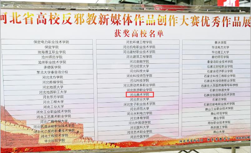 近日,河北省委防范办、河北省教育厅、河北省反邪教协会对河北省高校反邪教新媒体作品大赛获奖作品予以表彰,我校传媒学院教师王胜洋指导的李树桐、刘栋、刘建发、刘程、刘天阳、丁妍文的作品荣获数字短片类一等奖;王升、郭晓雨、蔡依瑾、李双、关紫晴的作品荣获数字短片类二等奖;陈欣怡的作品荣获数字短片类三等奖;动画学院学生张灏博的作品荣获漫画作品类三等奖。