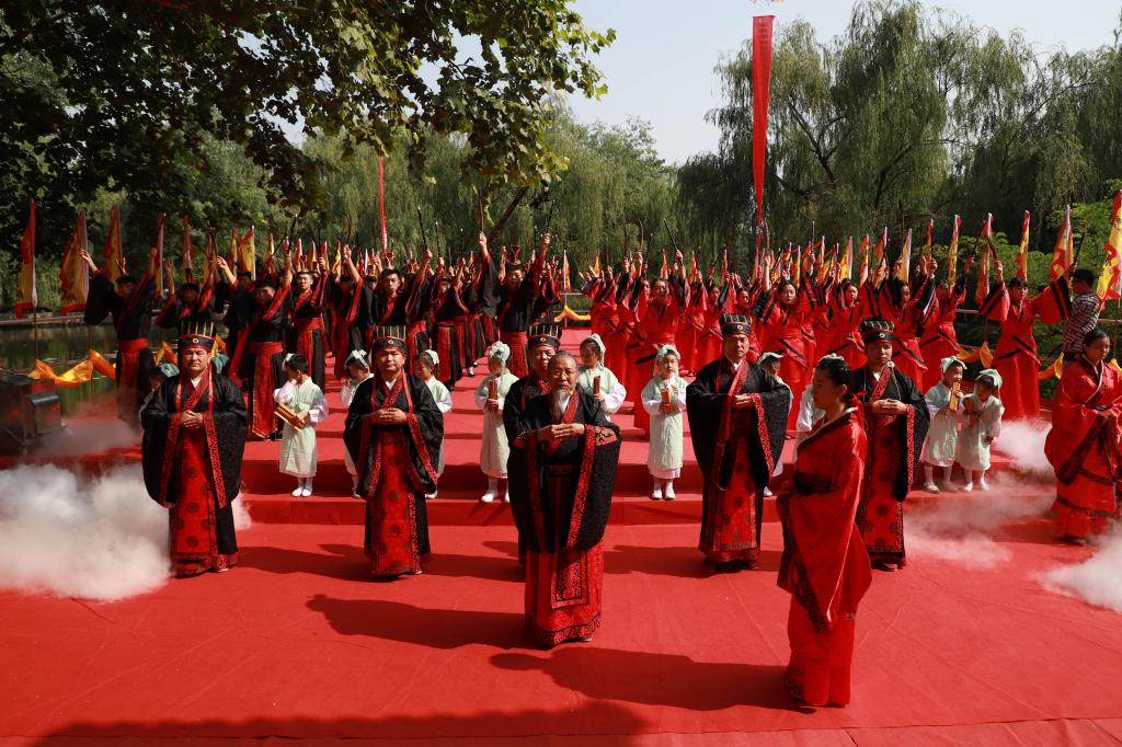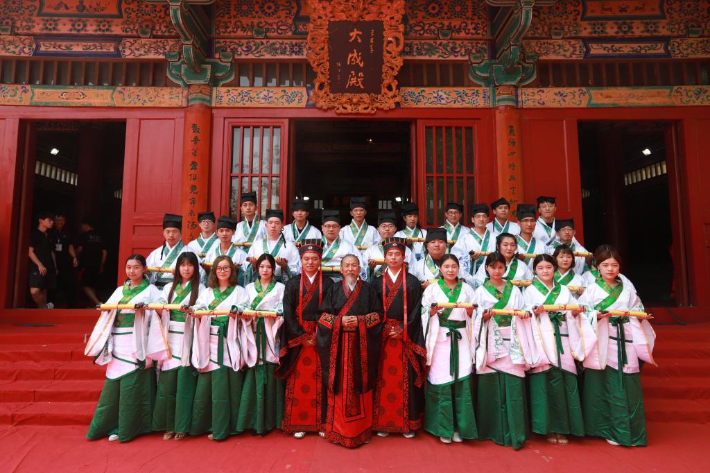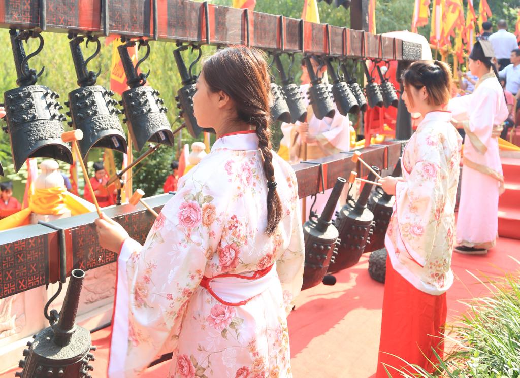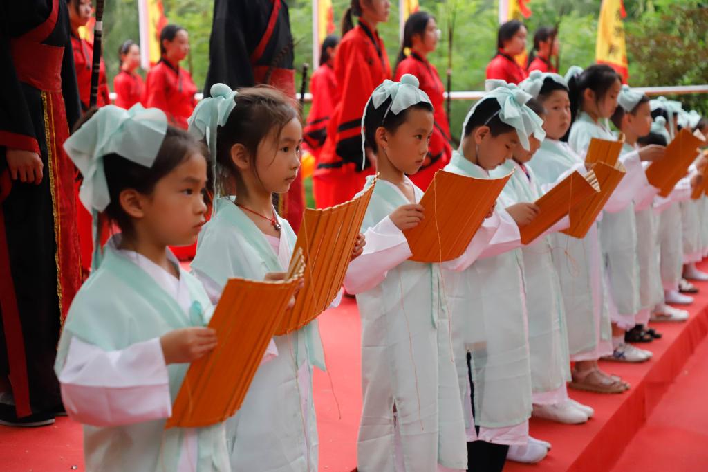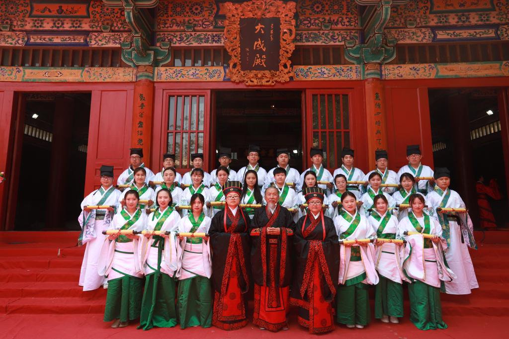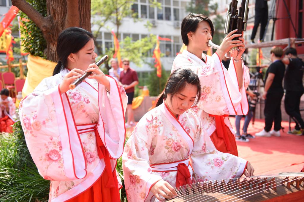 学校大成殿红绸装点,彩旗飘扬,古风汉韵,焕然一新。师生着汉服,肃立大成殿前,恭祭吾华夏圣师。古乐团的编磬、编钟、古筝奏响悠扬的祭祀雅乐。64位八佾舞者身着鲜红色古制式礼服,手执雉翟,踏乐起舞,动作庄严齐一。