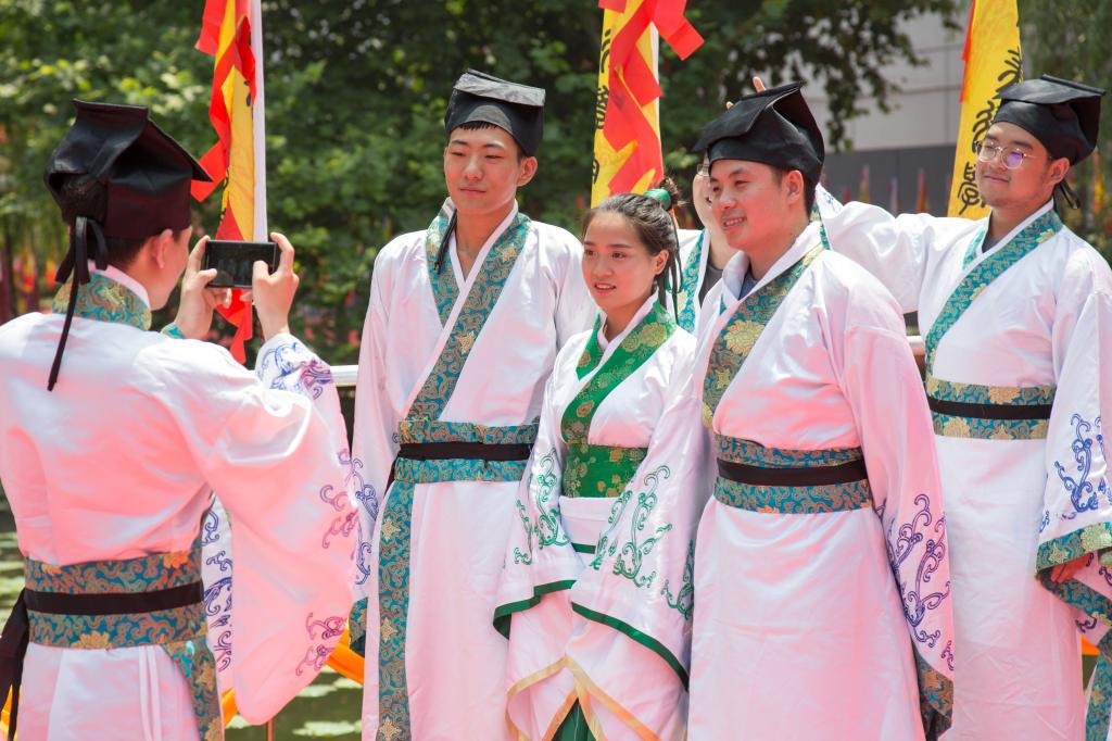 仪式结束后,身着汉服的毕业生徜徉在古香古色校园里与同窗亲朋合影留念。环境艺术学院毕业生周帅说,着汉服、行汉礼、参加自己的汉式毕业典礼,我们期待已久。庄重的仪式让我们深切感受“毕业”一词的重量,虽对前路感到彷徨,但是我们将带着母校祝福,走出属于自己的辉煌人生,他日成为河美骄傲。