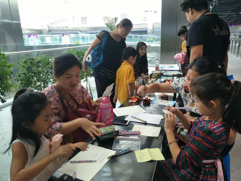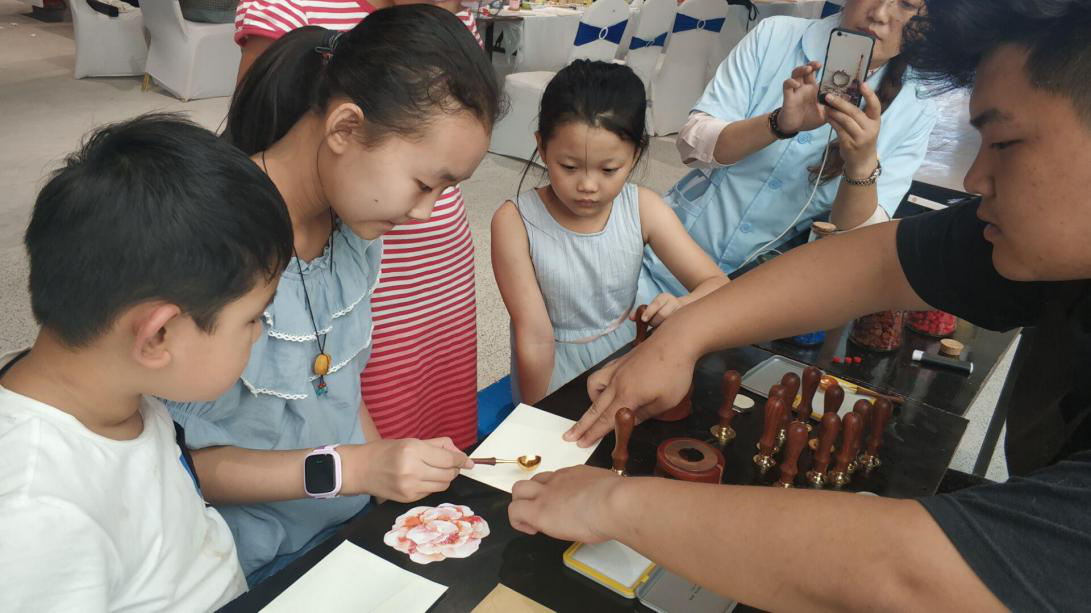 活动分为两个展区,十楼展区陈列着各种绘画、雕刻、缝纫、编制等手工艺品。我校展位位于十一楼体验区,由于本次活动临近教师节,我校借此之际推出时光邮寄、教师节贺卡+火器蜡封信体验。火器蜡封信是我国古代传统的封信方式,在让学生体验传统文化的同时能够将浓浓的爱意送给自己的恩师。