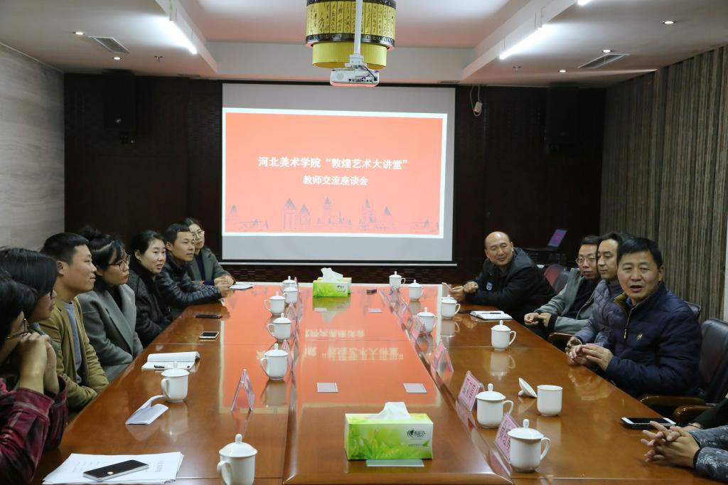 讲座结束后,吕爱教授与造型艺术学院院长姜兴达及教师进行“敦煌艺术大讲堂”交流座谈。经过讨论,吕爱教授计划将《敦煌书法》《翟奉达其人轶事(敦煌民俗)》《敦煌壁画“趣图”解读》《景教(基督教)碑、幢及敦煌景教文献》《敦煌历代装饰图案》等作为主讲内容,纳入明年的敦煌艺术大讲堂第二期中;同时将把敦煌艺术中的音乐、舞蹈、雕塑、体育等方向作为新的研究课题,进一步为大家讲解敦煌艺术在现代文化艺术中的延续与发展。参会教师与吕爱教授面对面的进行了交流与探讨。