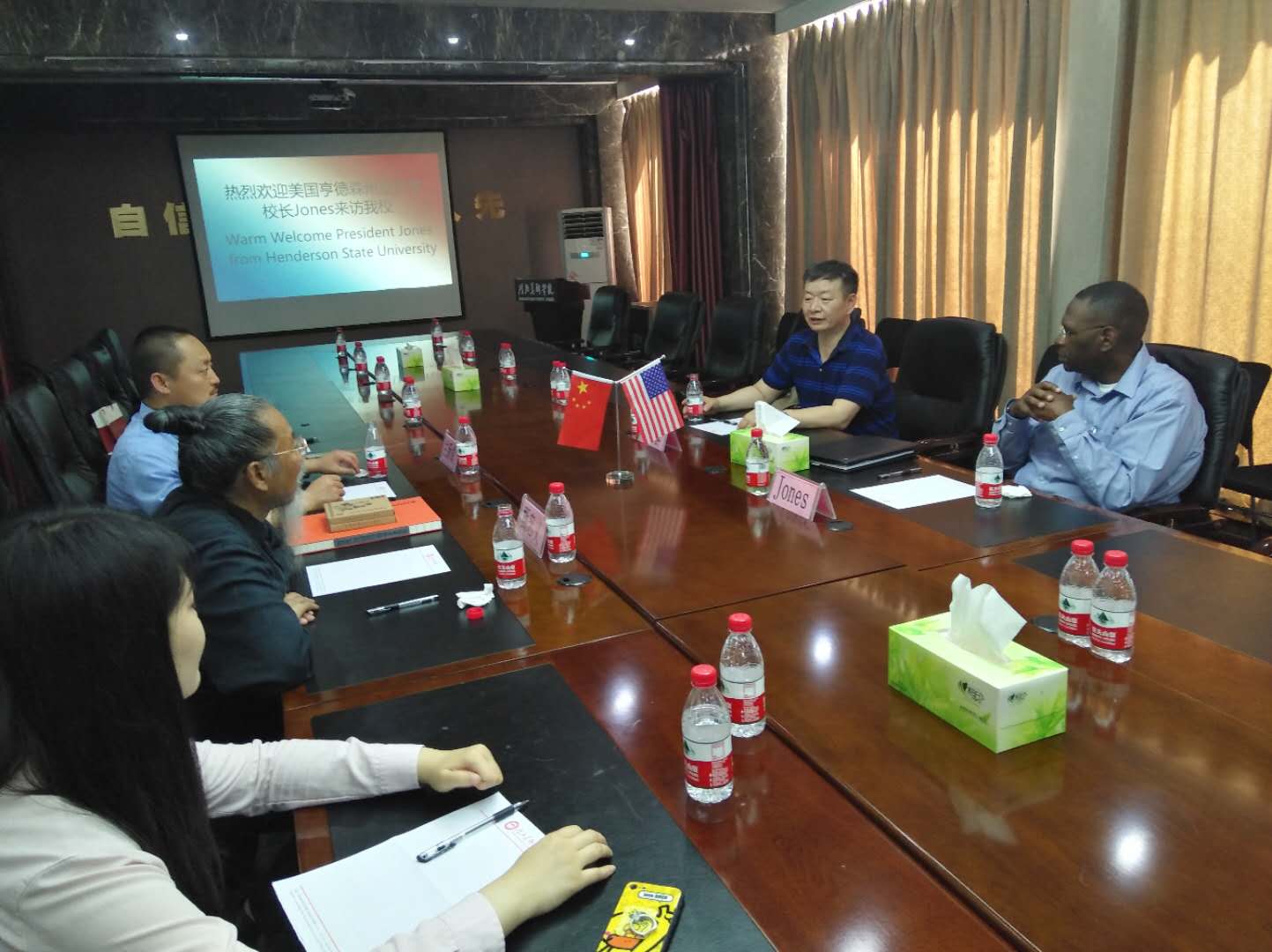 Jones校长此次访问是继2018年10月22日,鲍威尔副校长代表美国亨德森州立大学与我校正式签署“中美人才培养计划”协议和我校获批《中美人才培养计划》121双学位项目实验班的基础上,为进一步加强两校的合作,确保项目的顺利推进,能更好的为学生服务。