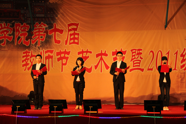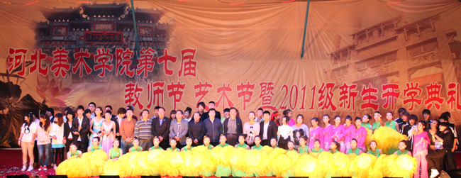 2011年9月27日晚7点,庆祝我校第七届教师节、艺术节暨2011级新生开学典礼的大型文艺晚会在学校体育场隆重上演。校长甄忠义、党委书记吴书元、常务副校长张建敏、副校长张子言、党委副书记副校长杨振江、副校长关栋华及各单位负责人和全体教职工、学生一起观看了晚会。