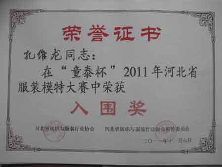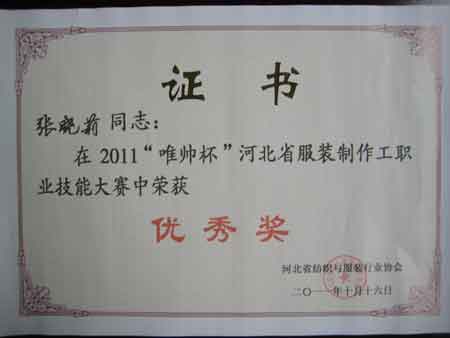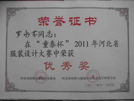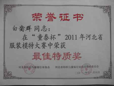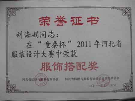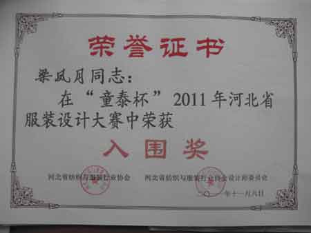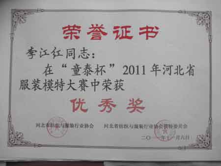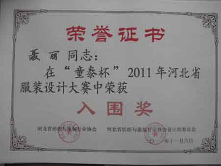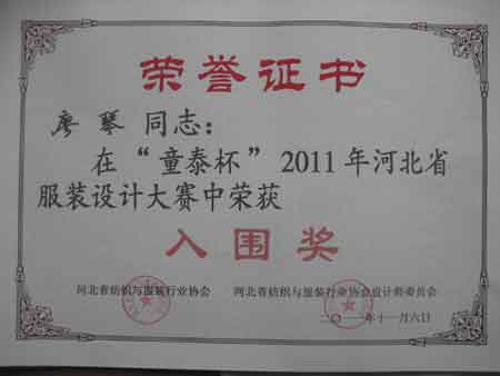 在2011“唯帅杯”河北省制作工职业技能大赛中我院学生姚杰、刘体红、张晓丽获得优秀奖。白裔群、刘海娟两位同学分别在“童泰杯”2011年河北省模特大赛和“童泰杯”2011年河北省服装设计大赛中荣获“最佳特质奖”、“服饰搭配奖”两项大奖,另外廖琴、梁凤月、孔维龙、聂丽、罗永芬等5位同学分别在服装设计大赛中荣获“优秀奖” 和“入围奖”,李江红同学在“童泰杯”2011年河北省模特大赛荣获“优秀奖”。