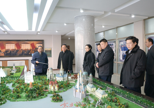 姜德果代市长在甄忠义校长的陪同下,参观了我校规划沙盘。参观结束后,姜德果与我校领导在综合楼会议室举行了座谈,在座谈会上,甄忠义校长就学校整体规划、远景目标、项目建设、人才师资引进、招生培养与市场化运作等情况作了详细汇报。