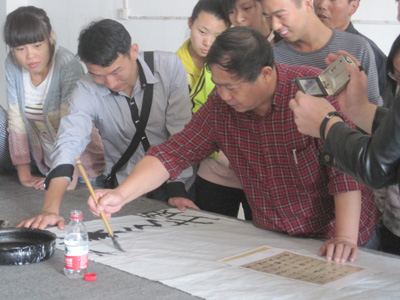 随后几天,曾翔先生对大三学生悬挂在教室的作品进行了逐一点评,并给予了高度评价;然后与学生互动,特别是对学生提出的流行书风问题作了精彩的回答,他把流行书风总结为十六个字:植根传统、立足当代、张扬个性、领引时风。最后,讲座在同学中的热烈掌声中结束!