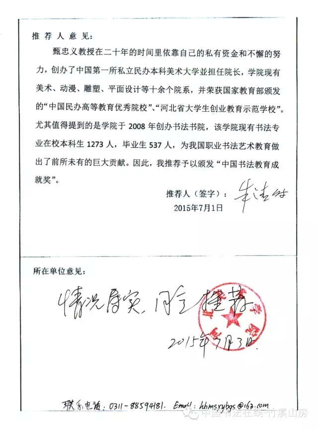 甄忠义教授在二十年的时间里,依靠自已的私有资金和不懈努力,创办了中国第一所私立本科美术大学并担任院长。学校现有美术、动漫、雕塑、平面设计等十余个院系,并荣获国家教育部颁发的“中国民办高等教育优秀院校”、“河北省大学生创业示范学校”尤其值得一提的是,该校2008年创办书法学院,该学院现有书法专业本科学生1273人,毕业生537人,为中国职业教育做出了前所未有的巨大贡献!