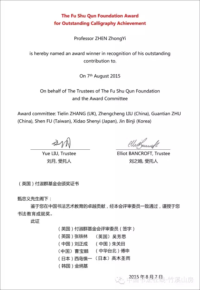 是以刘正成先生夫人的名字命名在英国成立的基金会,专门奖励致力于中国书法学术研究的人才。设立这个基金会正是确立一种民间文化价值观。付淑群基金会设立了一个国际性的评审委员会,由6个国家的十来个专家组成。这次,通过通讯表决,一致同意颁给甄忠义这个奖。这个评审委员的名单是:(英)吴芳思、張铁林、(中国台湾)傅申、朱关田、刘正成、曹宝麟、(日)西岛慎一、高木圣雨、(韩)金炳基。