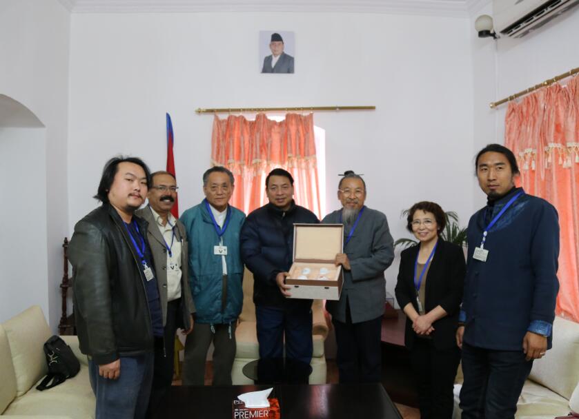 12月1日,尼泊尔副总统南德·巴哈杜尔·普恩接见甄校长一行,对考察团为中尼艺术文化交流做出的努力表示赞赏,并从文化、艺术、历史等方面与甄校长进行友好交流。甄校长将书法作品“海纳百川”及学校文创产品赠予副总统先生,并盛情邀请其访问我校。当天,甄校长与尼泊尔手工艺协会联合会主席达尔玛、副主席、财务主管进行洽谈,双方达成数项合作意向。