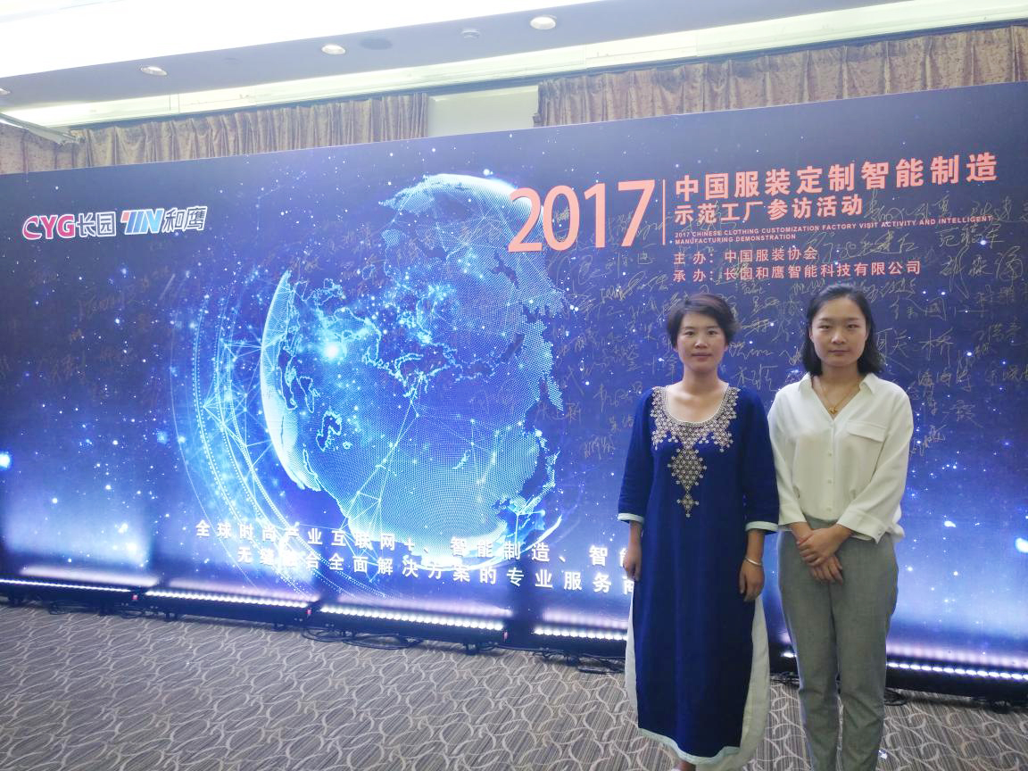 2017年9月5日,我校服装学院院长李珍与邵雯琪老师赴上海参加了由中国服装协会主办,长园和鹰智能科技有限公司承办的“2017中国服装定制智能制造示范工厂参访活动”。来自全国各地的服装品牌企业、服装制造企业、高等院校、地方协会、政府机构以及相关媒体共800余人在上午参观了上海峰龙科技有限公司的智能化改造示范工厂,在下午进行了一场高端论坛。