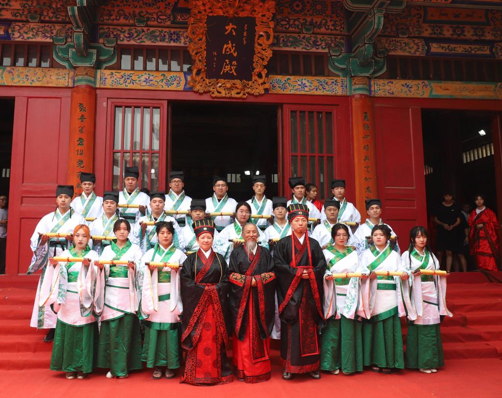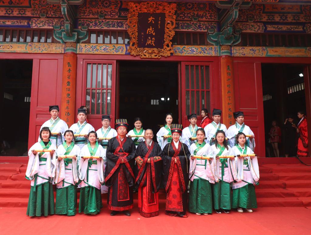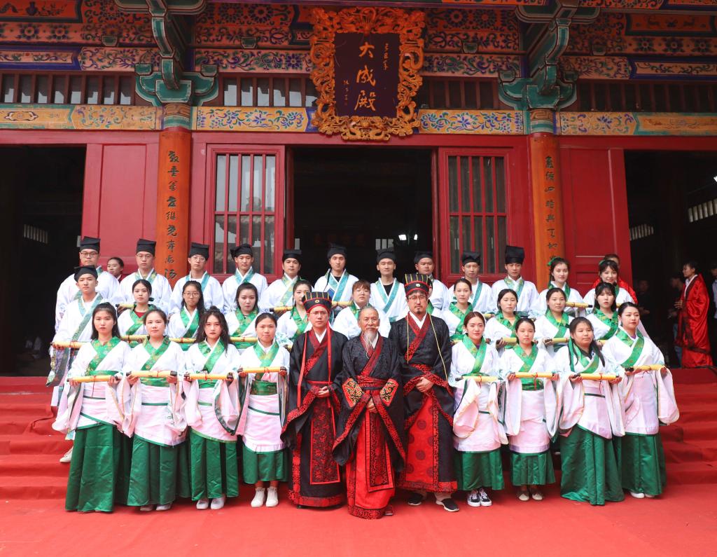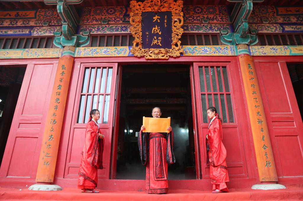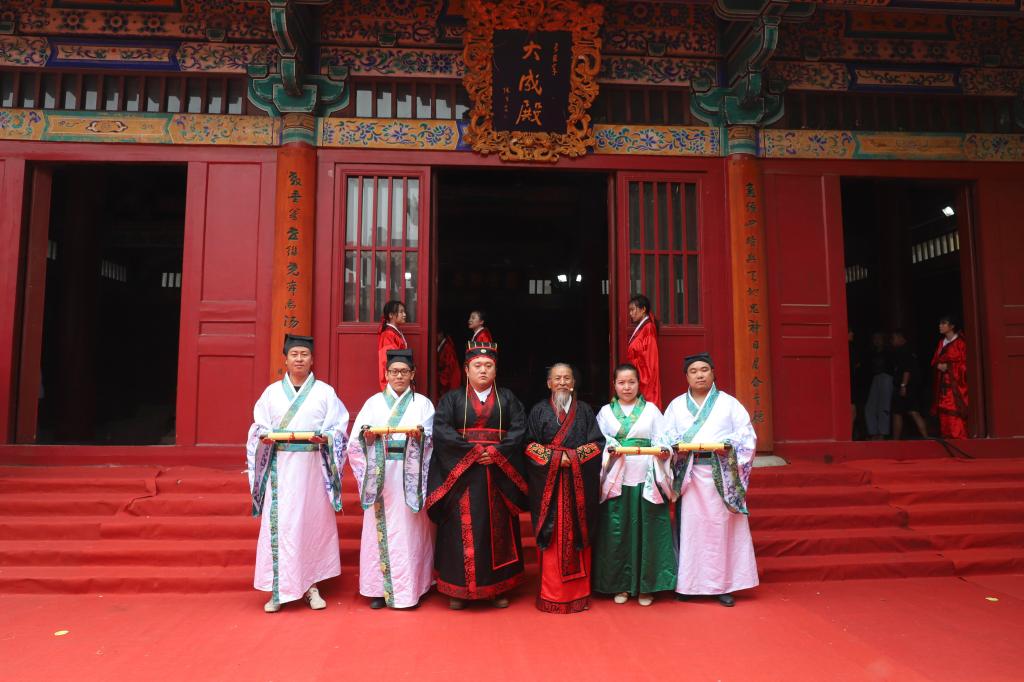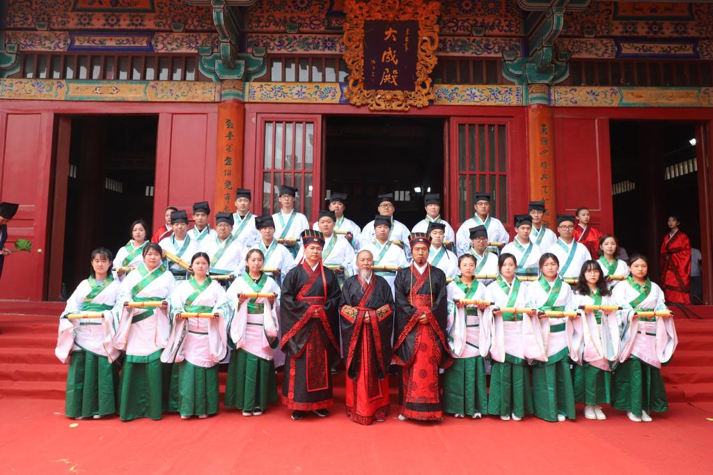 仪式严肃庄重。浑厚的钟声敲响了清晨的安静。一大早,师生着汉服,肃立大成殿前。上午8:30,礼赞高呼“启户”。古乐团演奏编磬、编钟、古筝,奏响悠扬的祭祀雅乐。64位八佾舞者身着鲜红色古制式礼服,手执雉翟,踏乐起舞,动作庄严齐一。