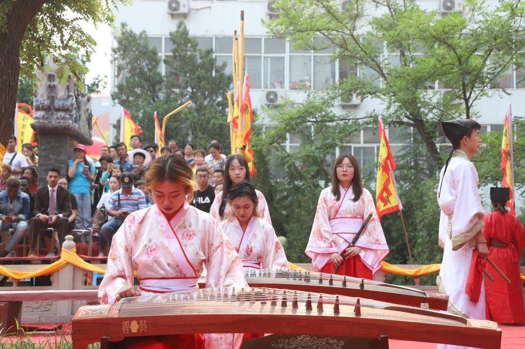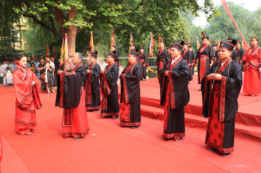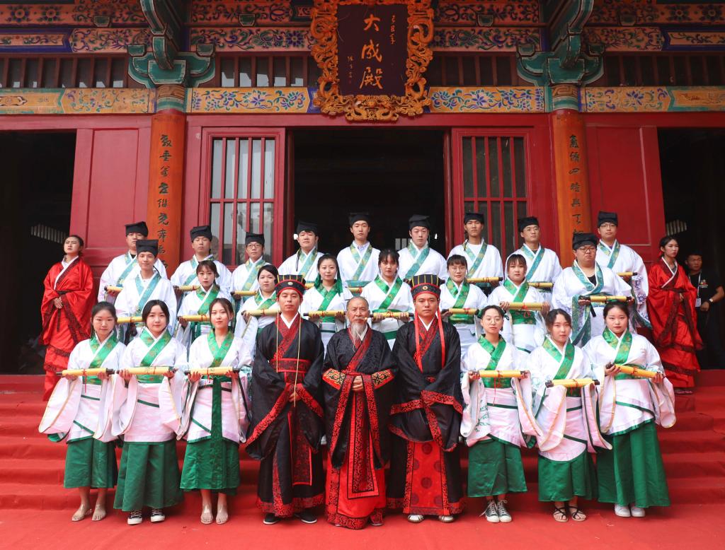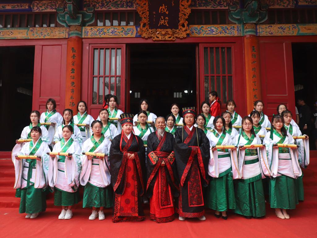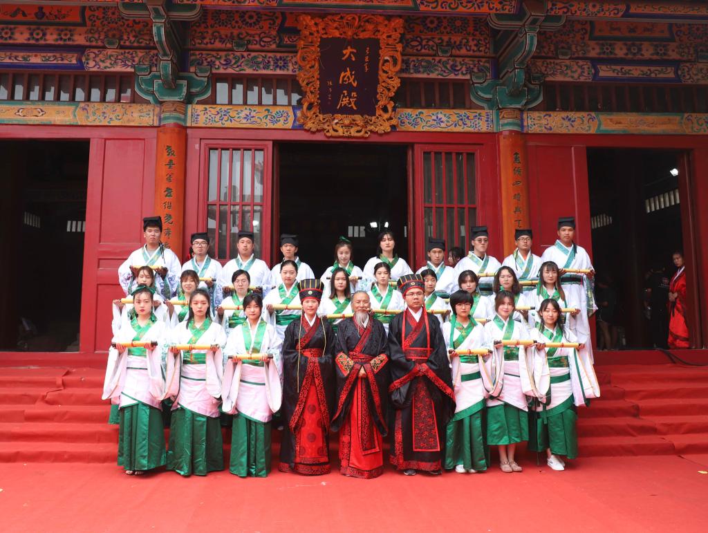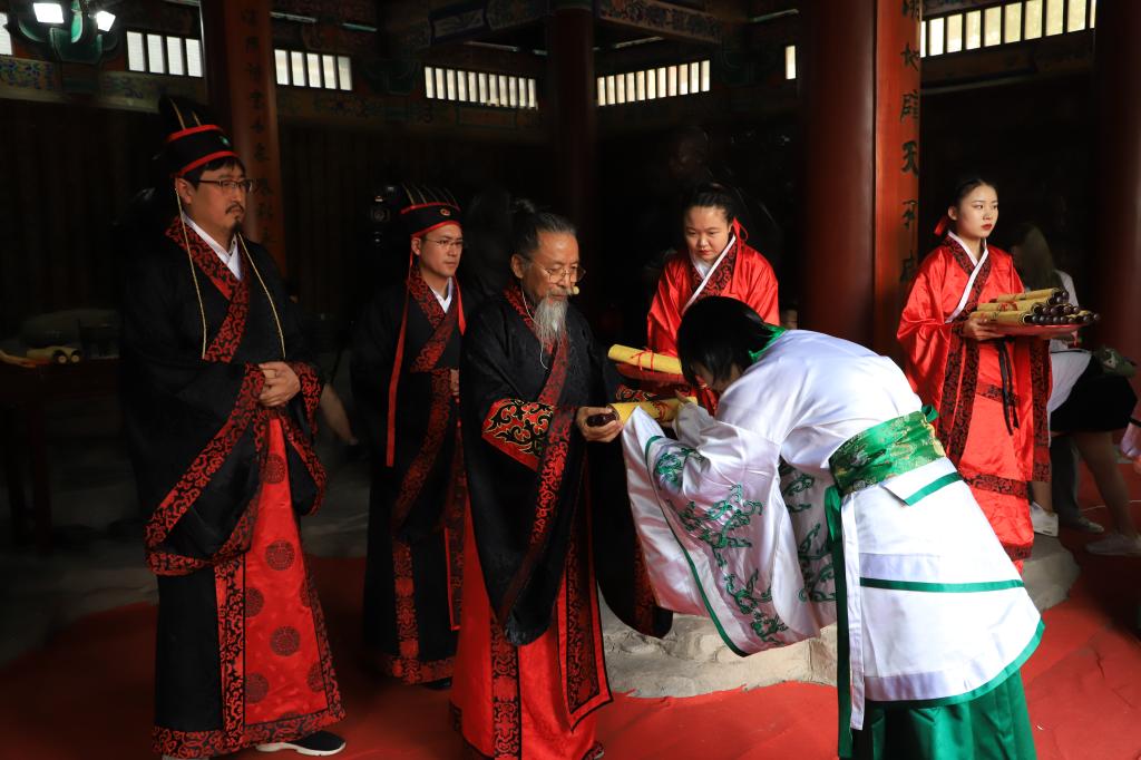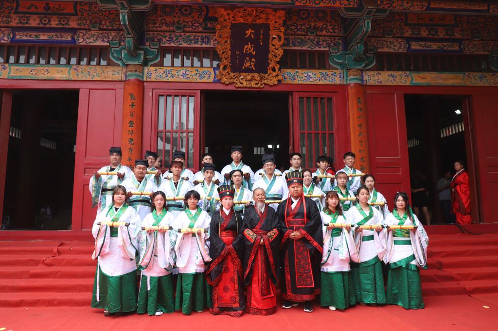 仪式严肃庄重。浑厚的钟声敲响了清晨的安静。一大早,师生着汉服,肃立大成殿前。上午8:30,礼赞高呼“启户”。古乐团演奏编磬、编钟、古筝,奏响悠扬的祭祀雅乐。64位八佾舞者身着鲜红色古制式礼服,手执雉翟,踏乐起舞,动作庄严齐一。