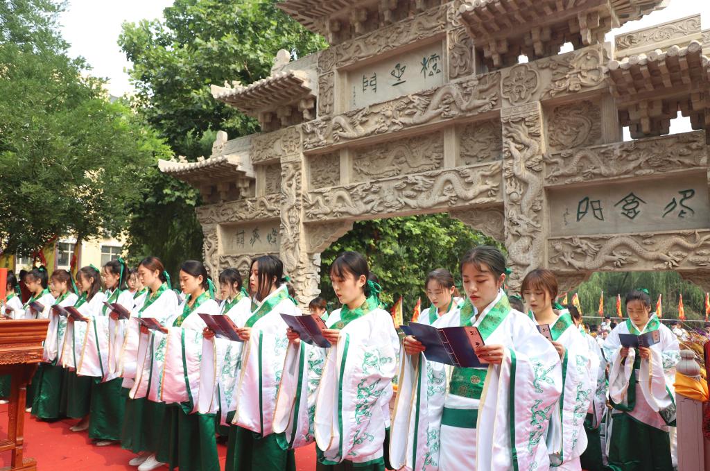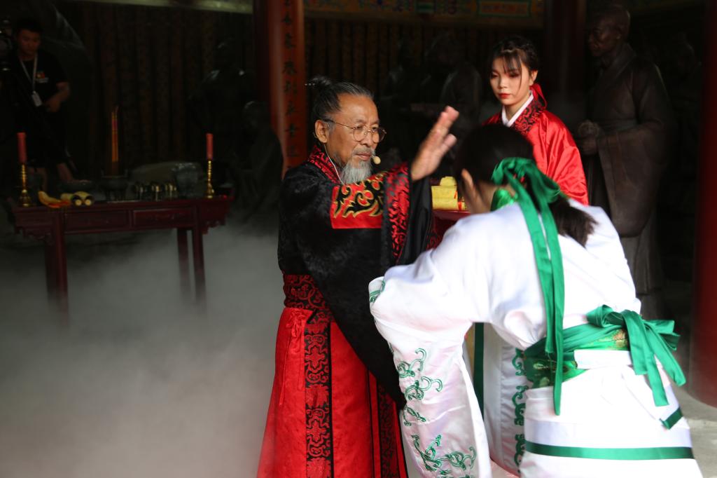 毕业生身着汉服进行“正衣冠”“孝亲敬师”“扫浮尘”“荷花净水”“爱抚”等仪式,领取人生中第一个学位证书,以三拜之礼感恩老师和父母。