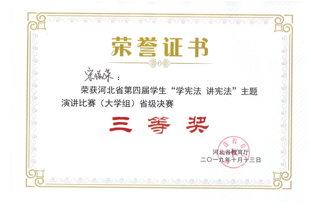 宪法是国家根本大法,是治国安邦的总章程,具有最高的法律地位、法律权威和法律效力。为使广大青少年学生深入学习了解宪法、尊崇宪法,弘扬宪法精神,增强法治观念,根据教育部关于第四届全国学生“学宪法讲宪法”活动总体要求,河北省教育厅于10月11日-14日成功举办河北省大中小学生法治知识竞赛和第四届大中小学生“学宪法讲宪法”演讲大赛暨全国选拔赛。由我校传媒学院播音与主持艺术专业路雯皓老师、刘喆老师指导的2018级学生宋悦容作品《峥嵘岁月砥砺行,法治中国驻我心》经过激烈角逐,最终荣获大赛三等奖。