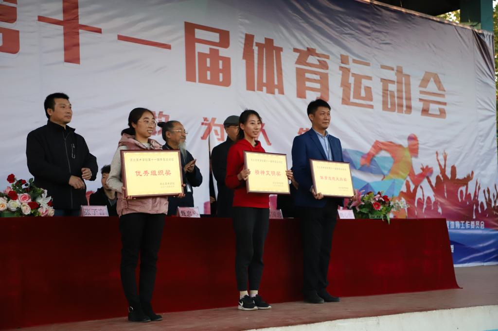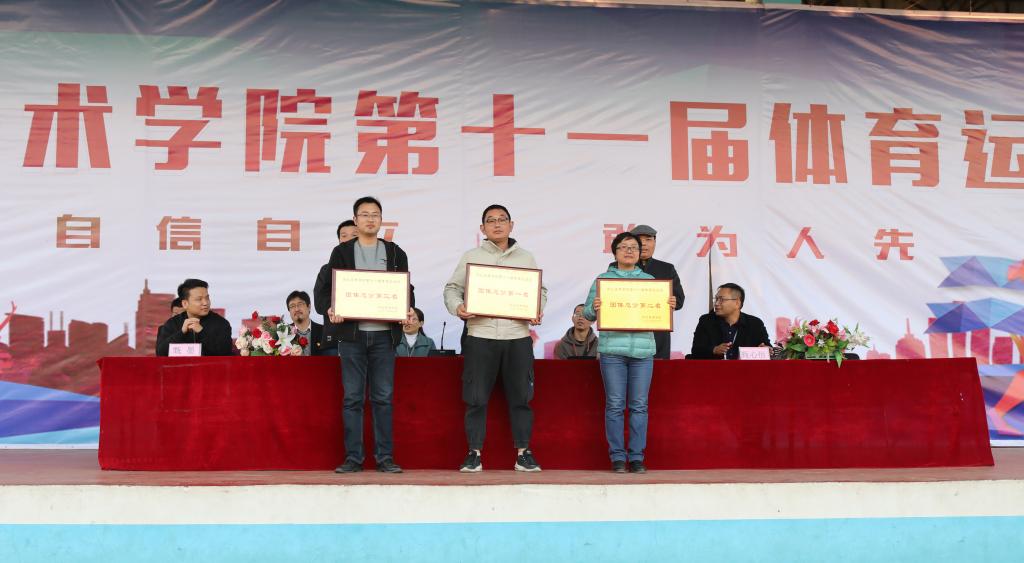总裁判长齐瑞明宣布比赛结果。本届运动会共有45个项目组成,130余名教师和1300余名运动员参加,共打破了我校7项校运记录。经过为期两天紧张激烈的比赛,服装设计学院获得优秀组织奖,工业设计学院获得精神文明奖,环境艺术学院获得体育道德风尚奖;传媒学院荣获团体奖第一名,书法学院二队获得团体奖第二名,书法学院一队获得团体奖第三名。学校领导分别为获奖学院颁发奖牌。