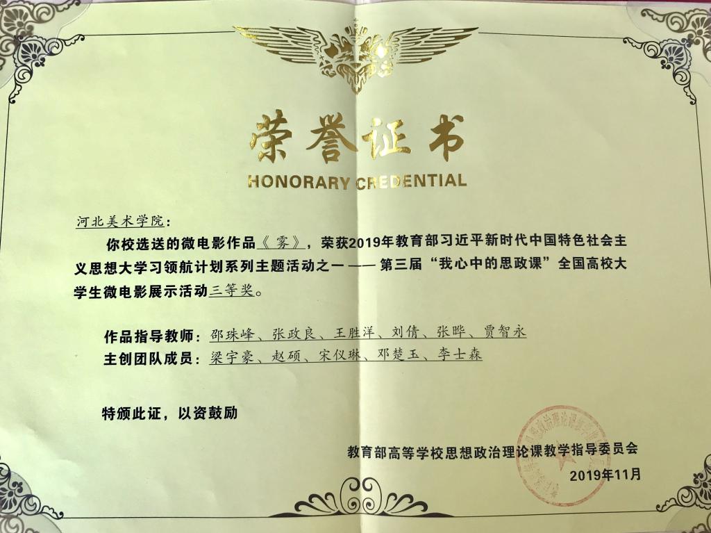 2019年11月23日,第三届“我心中的思政课”全国高校大学生微电影展示活动颁奖礼在武汉大学举行。经我校报送、省教育厅评选推荐的学生微电影作品《雾》荣获本届大赛三等奖。指导教师、创作学生应邀出席颁奖典礼。