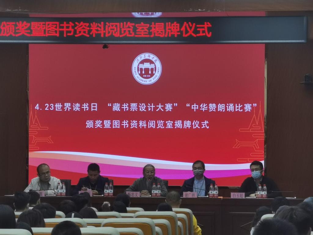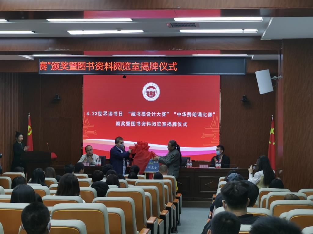 颁奖仪式结束后,校长甄忠义和馆长谢广林为环境艺术学院图书资料阅览室揭牌。