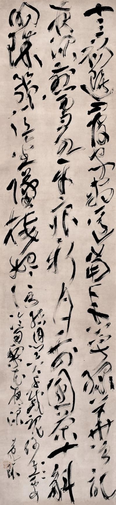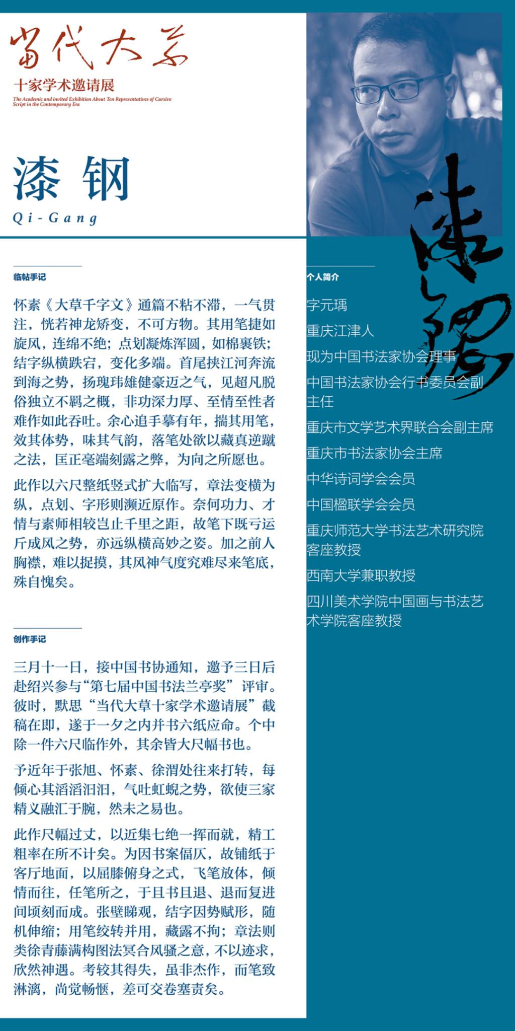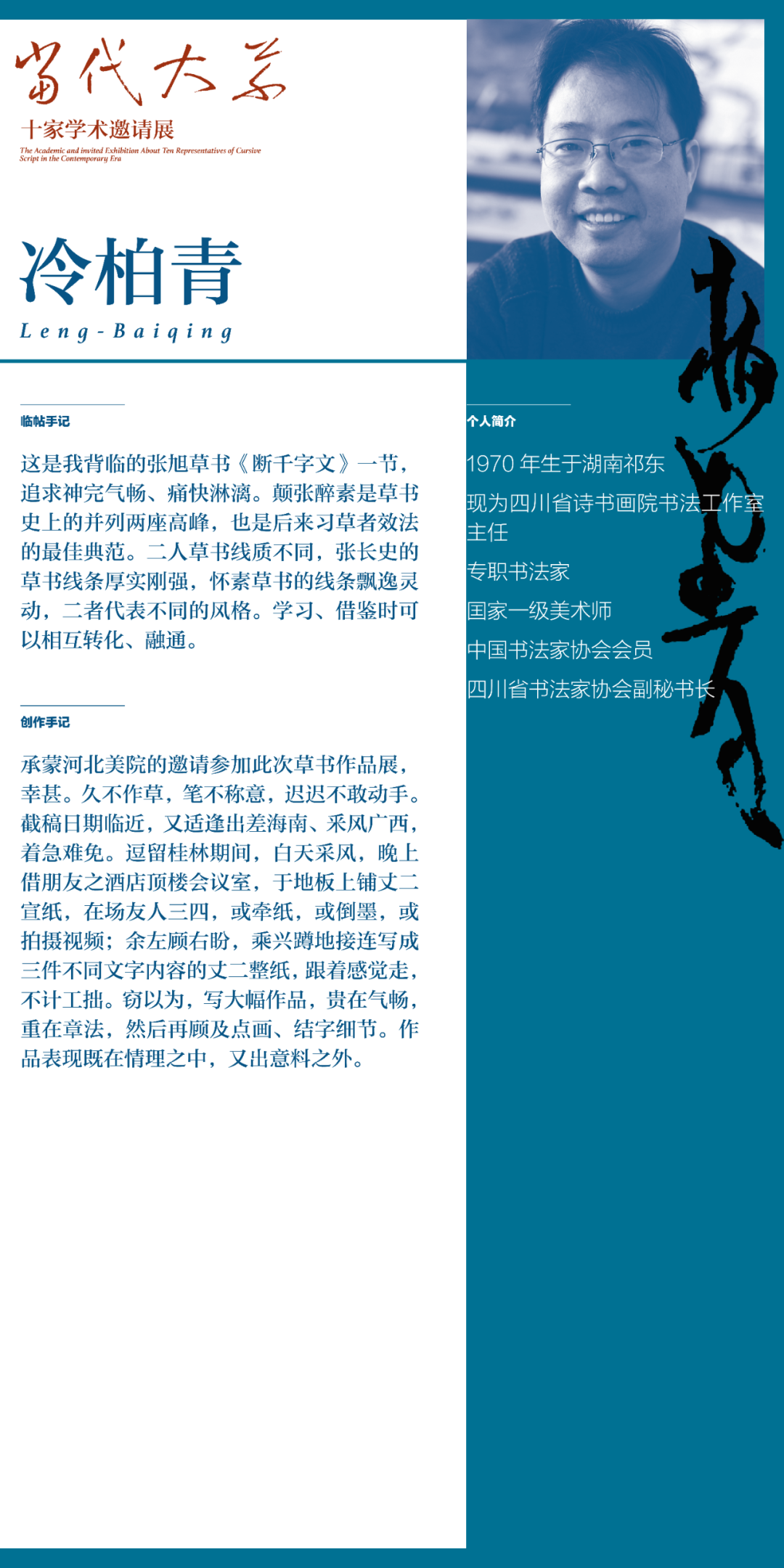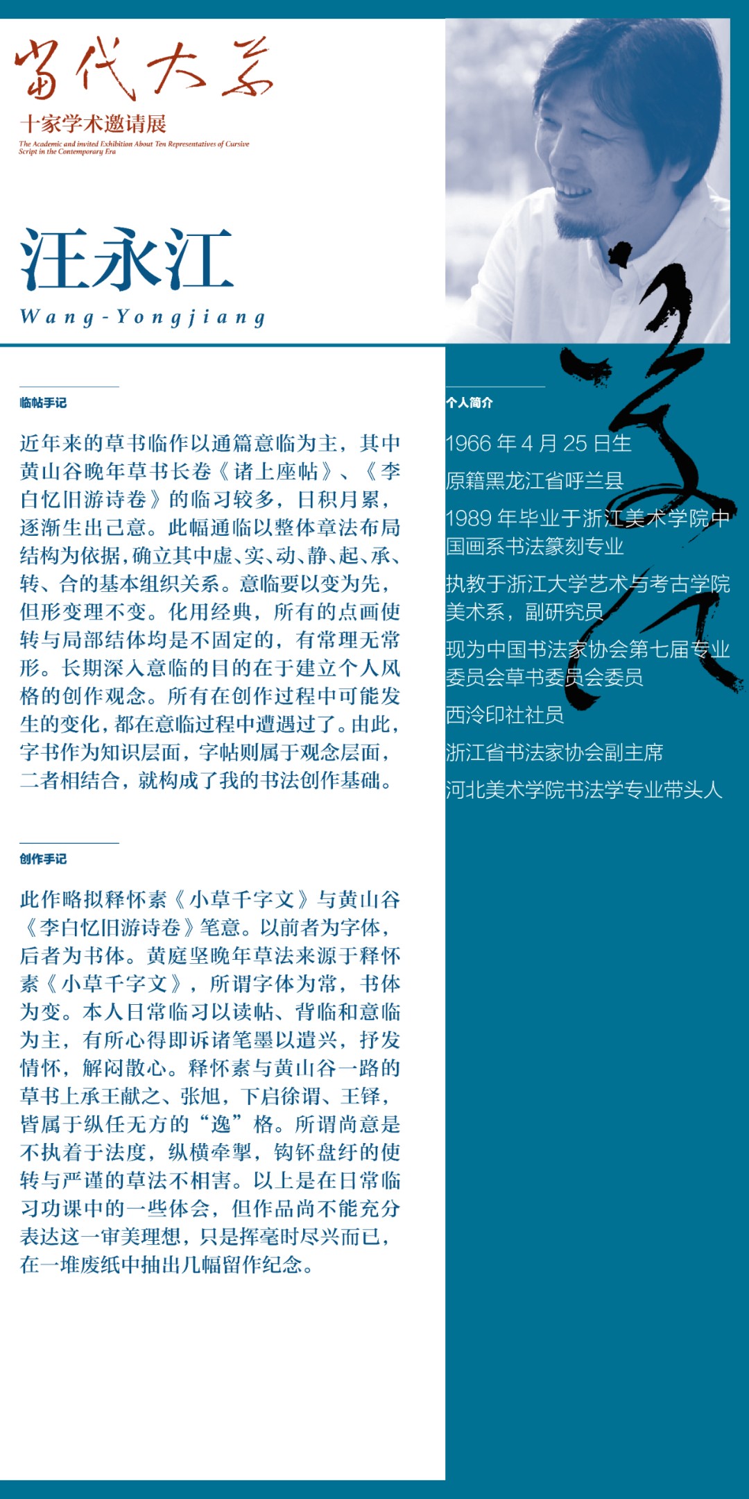 考虑到当代书法于古典传统的恢复只有短短的四十余年,它的再生还带着很多不确定性,并且几乎是在一个时代的剖面上,而要承受来自传统,近现代与西方现代性三个方面的冲击并需作出应激反应,如此一来,我们对当代书法便不得不抱有某种宽容与同情。 也几乎在同时,当代书法便被命定地抛入一个危机性境遇,而不得不承受某种天命,它既不能不加改变地与传统共存,也不能游离于经典传统之外任意而为。而要建立时代性权威,则几乎无法在经典传统与时代风格创造之外去寻找。“更进一步的问题,在何种程度上,古老的视觉产生被引入新的艺术风格阶段。一种永久的艺术发展是如何和一段特殊的艺术发展相混合的。这些问题都只能结合具体情况进行分析。”(沃尔夫林《艺术史的基本原理》)这一点可能是尤为重要的。站在中西碰撞的现代境遇来审视本土古老传统书法,很容易产生一种激进情绪和变革冲动。现代性以一种天然的合法性给艺术家以鼓动,而走向变革与冒险。由此,当我们对现代性处于被动接受之际,它对本土文化艺术的冲击与伤害便势在难免。不得不承认,我们当下仍处于一种被支配的现代性惯性之中。在这种现代性观念支配下,很难冷静理性地思考书法经典传统与本土文化命运问题。书法也不例外。很多情形下,我们往往将传统作为现代的对立面,因而对传统与现代缺乏主体间性的思考,而尤为强调了两者之间的对立冲突。由此书法便成为单面的存在。而更为致命的是,在对现代性偏面的理解下,形式冲动代替精神本体成为现代性的标志。书法由此丧失了精神本源与历史文化向度。 瞻顾书史,古老书法传统是这样一种产物:它由内容(文化)积淀为形式,而不是单纯的形式化。草书尤其如此。它将书法线条抽象化到极致而贯通形上哲学。“一条线通贯着大宇宙。”(罗丹语)因而宗白华说:“中国书法的线不是西方几何的线,而是一阴一阳之谓道,宇宙自然的气韵变化。是道舞空白的大化流行。”从这一点之笔流出万象之美。开始于一画,既流出人心之美,也流出万象之美。”(《美学散步》) 中国草书的线条,更是体现出阴阳往复翕辟,气韵生动即生命的节律。而张彦远在《历代名画记》中所称“气脉通连,隔行不断”即指“一笔书”阴阳通贯,无不往复。天地之际的绵延之维与生命之道。也表明狂草的最高精神与宇宙自然相融合。 “当代大草十家学术邀请展”,应该说不是一个一般意义的应酬性展览,而是带有批评的立场与目的。它与“晋唐一体—— 全国草书史学术论坛”同时举办便明确表明了这一点,进而也增强了它的学术性与史学性。草书发展到当代,已提示出将草书置于书史语境与“问题丛”中加以审视批评的重要性。质言之,当代草书已进入到需要历史化的进程之中。长达两个世纪的碑学对帖学的统辖已经终结,晚清民初以来持续产生创作效应的碑帖融合一路也已趋于式微。帖学已然独立并推动帖学获得复兴与拓化,这为当代草书创作带来先机。只是当代草书家准备好了吗?这种现实的发问无疑还是必要的。“我们需要多角度的观点和不同看法”。这至少需要从草书史的立场来认识与厘清草书史的周期性与连续性及草书史高峰的标立;其中最重要的则是草书史风格的衔接与嬗变及价值确立。“既使是最卓越的天才也不可能超越一些设定好的限制或超越它的时代,并不是总是一切皆有可能。特定的思想也只能在某个发展进程中才会产生。”(沃尔夫林《艺术史的基本原理》) “当代大草十家学术邀请展”无疑集聚了从20世纪50年代横跨80年代四个年龄段的当代优秀的草书家。十位书家在草书创作领域有着无可争议的代表性。他们的草书创作风格各异,对草书的取法阐释有别,但其共同点则表现在皆以其个性化的草书创作表达了他们的草书审美理想。他们的草书体现出草书经典传脉的当代表达,是草书发生价值转换的重要界面与一环,通过他们的草书创作甚至可以对当代草书存在状态作出一定价值判断,从而体现出他们草书创作的当代张力。但正如当代书法经过四十年发展,又归结到一个新的节点与转捩一样。他们的草书创作也面临着一个节点,即是满足或停留于个性意志的创作,还是选择有难度的艺术史进步意义的书法创作。对于草书家而言,选择了草书就等于选择了书法史意义上的挑战,这种创作选择本身就包含着历史与现实、风格与精神的双重结构,同时还寄寓着思言道的定在。正如方闻在《心印》“伟大的传统”导言中所说:中国的文学、书法和绘画,不但有一个完整而连续的历史,而且这历史还与一个强大的道德精神传统—— 一种有精神目的却又充满自由多样行为的意识是共同发展的。注重道统,不具备对文化传统中道的认识,任何独特的或者怪异的思想,不管有多么奇警,只能导致妄作,不能载入新的史册。对更新传统原理轮回的信赖导致了种种人在实践上模仿古代典型的心理。以后历代成功的更新无不有赖于恰如其分地复兴古代的风格(《心印》)。 由此,在本土传统文化包括书法整体复兴的主潮中,反思西方现代性和固守本土文化价值—— 穿越西方回到中国,是一个重要课题。中国传统书法与古典文化传统相似,皆是思言道的统一,而不是西方形式化的单维扩张,认识把握到这一点无疑是至关重要的,它表明中国书法