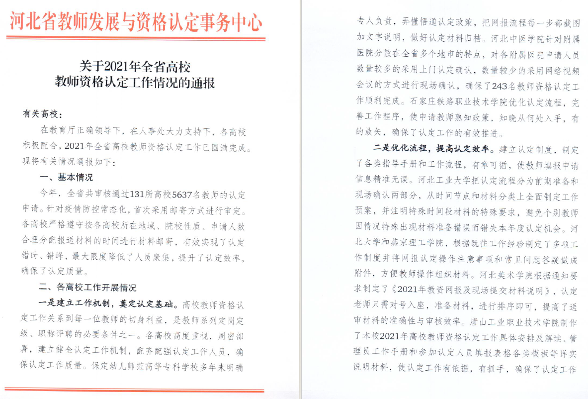 河北省教育厅教师发展与资格认定事务中心对我校2021年高校教师资格认定工作进行全省通报表扬,充分肯定我校在时间紧、任务重和疫情防控严峻形势下能够按要求出色地完成本次认定工作,表扬我校在全省131所高校中表现突出、举措到位、程序合理,确保了整体认定的精准性。本次全省包括我校在内共计13所高校受到通报表扬。