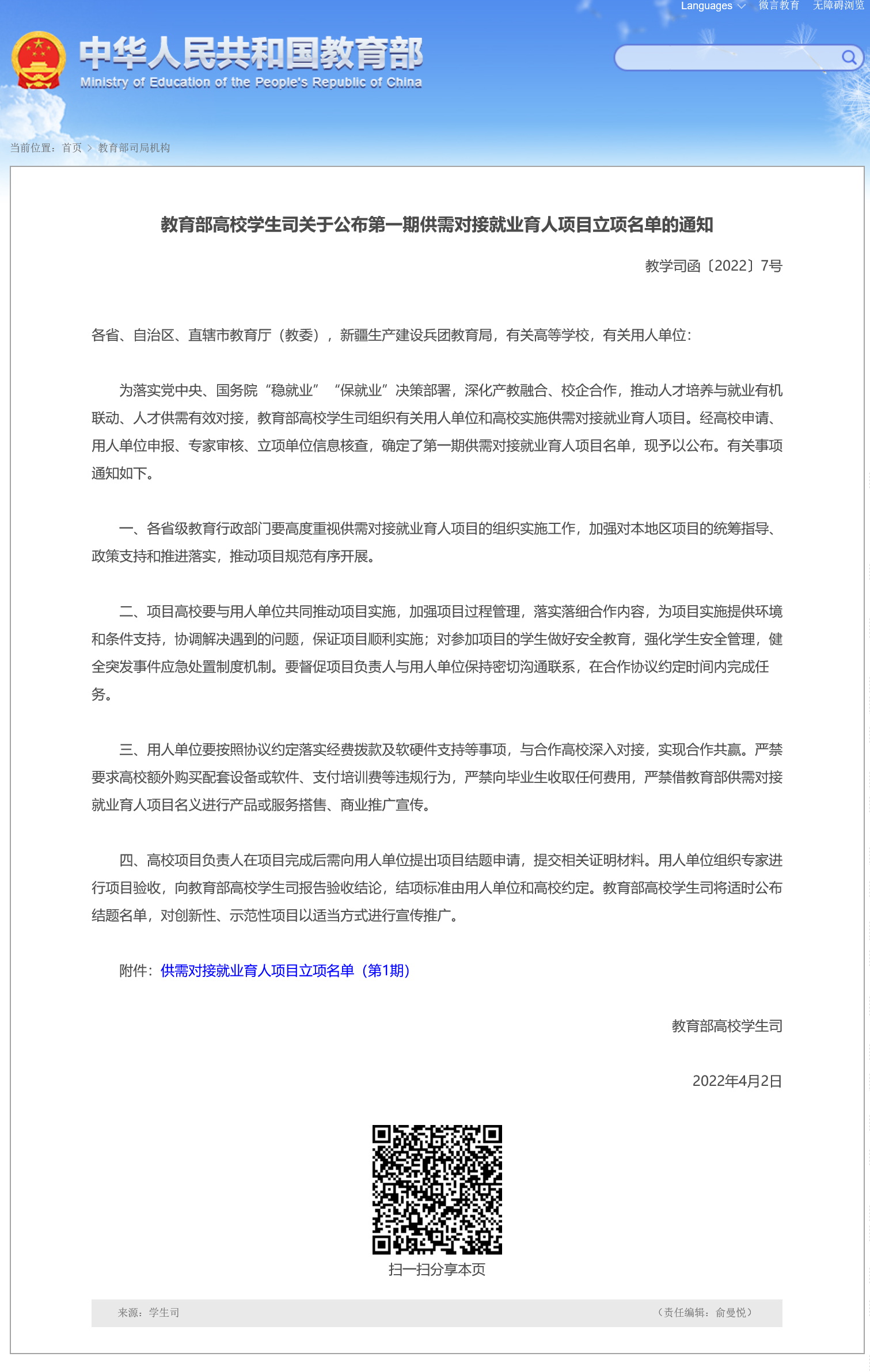 落实党中央、国务院“稳就业”“保就业”决策部署,深化产教融合、校企合作,推动人才培养与就业有机联动、人才供需有效对接,教育部高校学生司组织有关用人单位和高校实施供需对接就业育人项目。我校与北京志恒教育科技有限公司、山东创合汇文化发展有限公司、北京佳玥科技有限责任公司、沈阳品索工业设计有限公司建立初步合作意向,经我校申请、用人单位申报、专家审核、立项单位信息核查等流程,顺利通过审批,六项就业育人项目获得教育部立项。