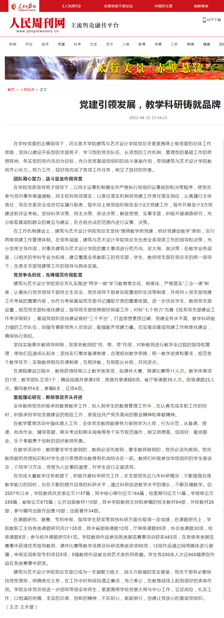 4月19日,人民日报河北站记者专访我校建筑与艺术设计学院党总支书记王杰、第二支部书记王永堂,并在人民周刊网刊文《党建引领发展,教学科研铸就品牌》,介绍了建筑与艺术设计学院的党建工作,重点突出了党建活动的品牌建设。