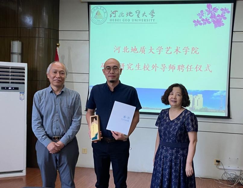 河北地质大学研究生学院院长赵淑芹和艺术学院院长齐勇向我校陈利伟颁发校外导师聘书和奖杯