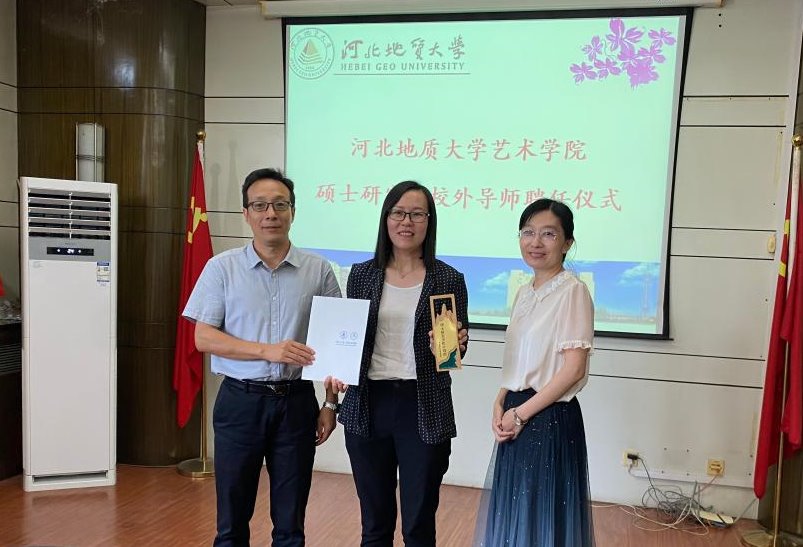 河北地质大学研究生学院副院长段亚敏和艺术学院副院长李涛向我校任丽芬颁发校外导师聘书和奖杯