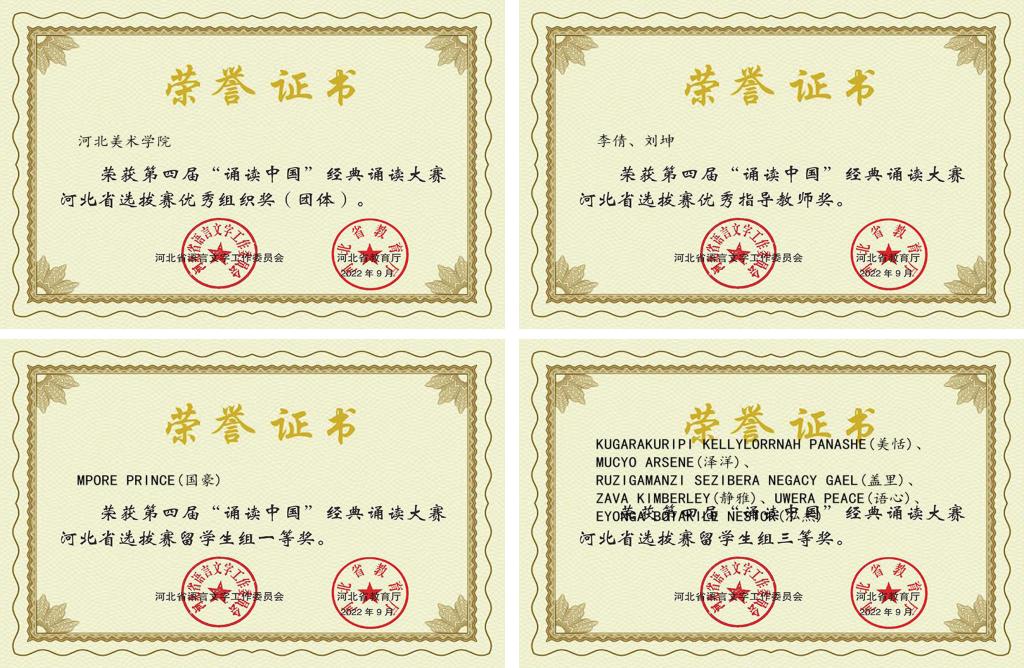 近日,第四届中华经典诵写讲大赛“诵读中国”河北省选拔赛评奖结果公示。我校荣获河北省语言文字工作委员会、河北省教育厅颁发的“优秀组织奖(团体)”。