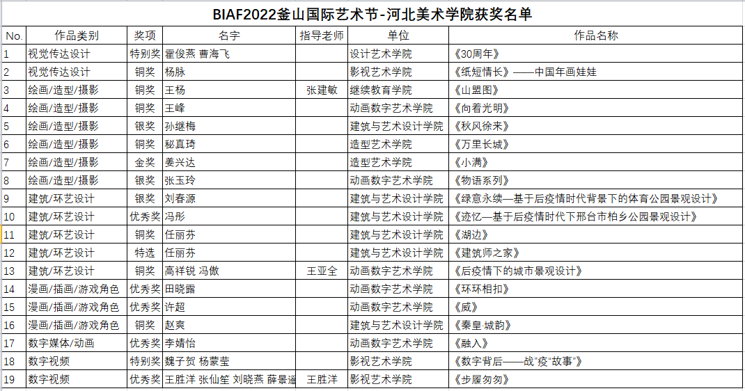 近日,“BIAF2022釜山国际艺术节”在韩国釜山落下帷幕。本届艺术节由中韩艺术文化交流研究院、韩国釜山市政府、釜山市议会、釜山市教育厅联合举办,我校与北京电影学院、浙江传媒学院等国内高校作为支持单位,参加了这次盛会并喜获佳绩,荣获各级奖项19项。