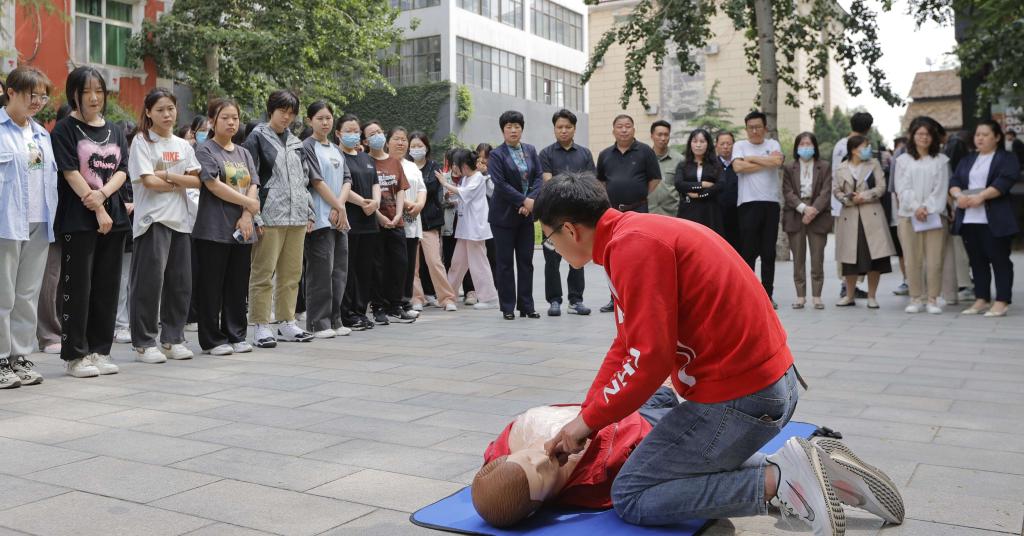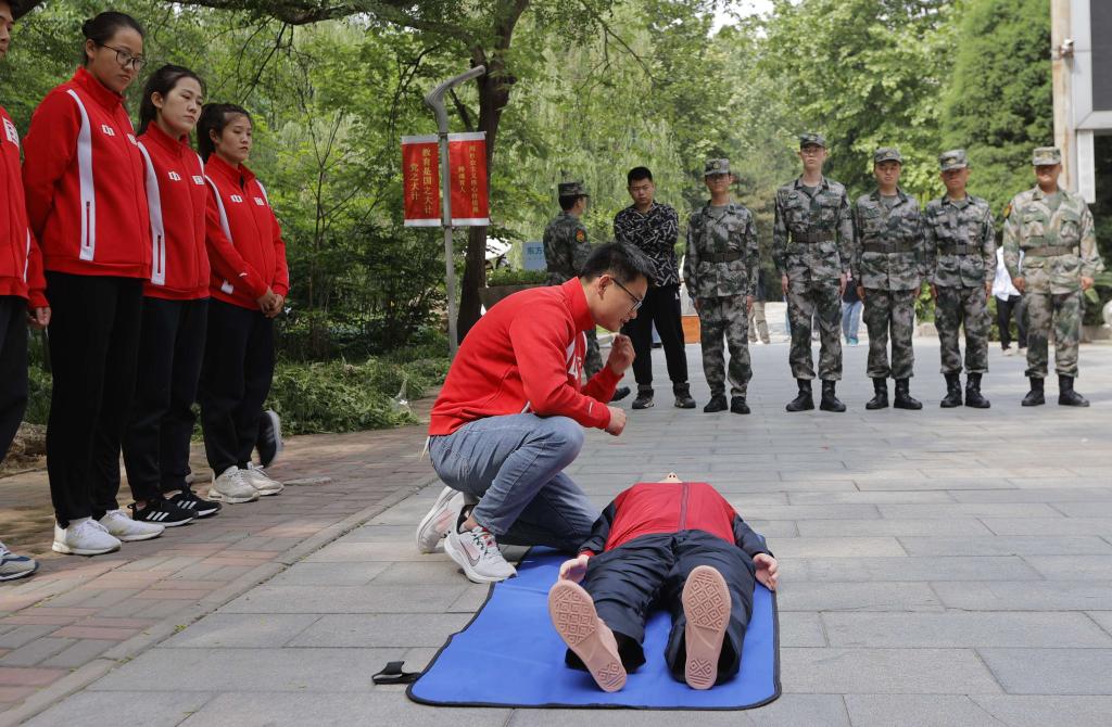 揭牌仪式结束后,所有参会人员到明德广场参加应急培训演练,演练由我校体育工作部应急救护培训教师演示操作。