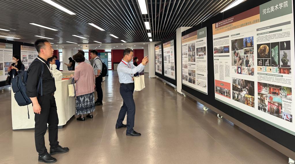 活动期间,我校组织第十三期石雕研培班相关材料参展,非物质文化遗产研究中心主任、设计艺术学院院长董小龙代表学校在展览现场为文化和旅游部饶权副部长汇报介绍石雕研培成果,在会场以“研培教学与高校非遗学科专业建设”为题做专题发言。会议上文化和旅游部饶权副部长、非遗司王晨阳司长、教育部高等教育司二级巡视员、人文社科教育处张庆国处长等领导为中国非遗传承人研修培训计划2021—2022年度绩效考核获评优秀的院校颁奖。