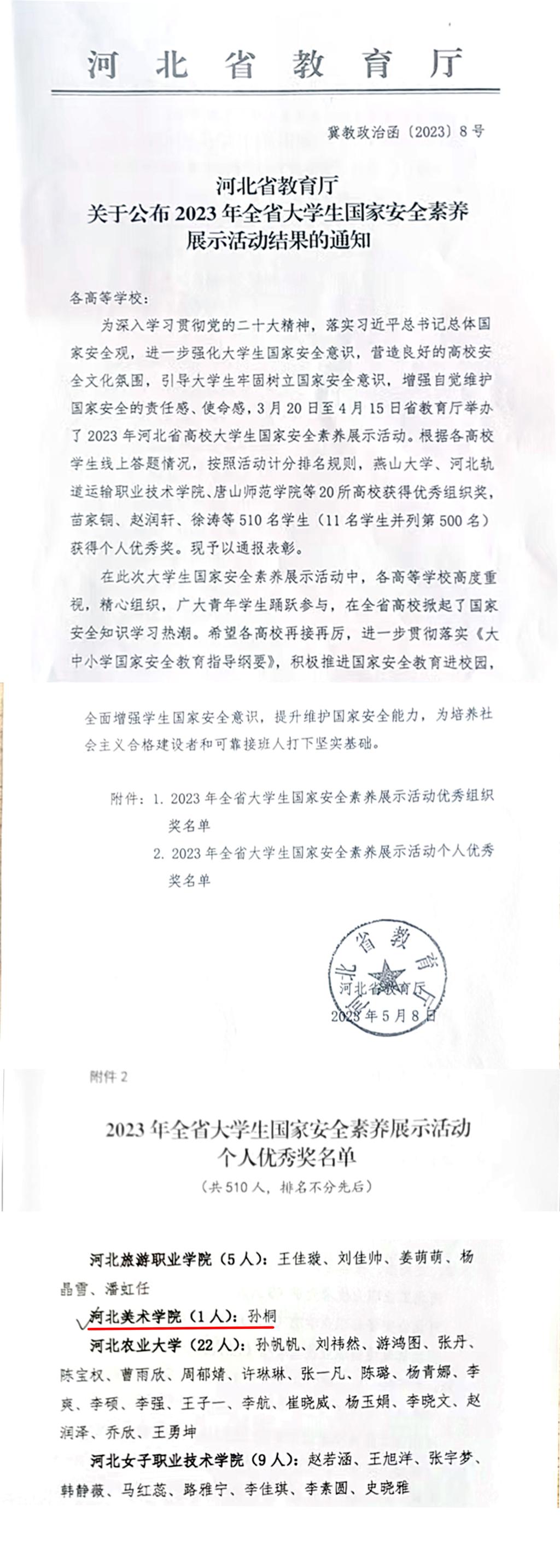 近日,河北省教育厅下发《关于公布2023年全省大学生国家安全素养展示活动结果的通知》,我校学生孙桐荣获个人优秀奖。