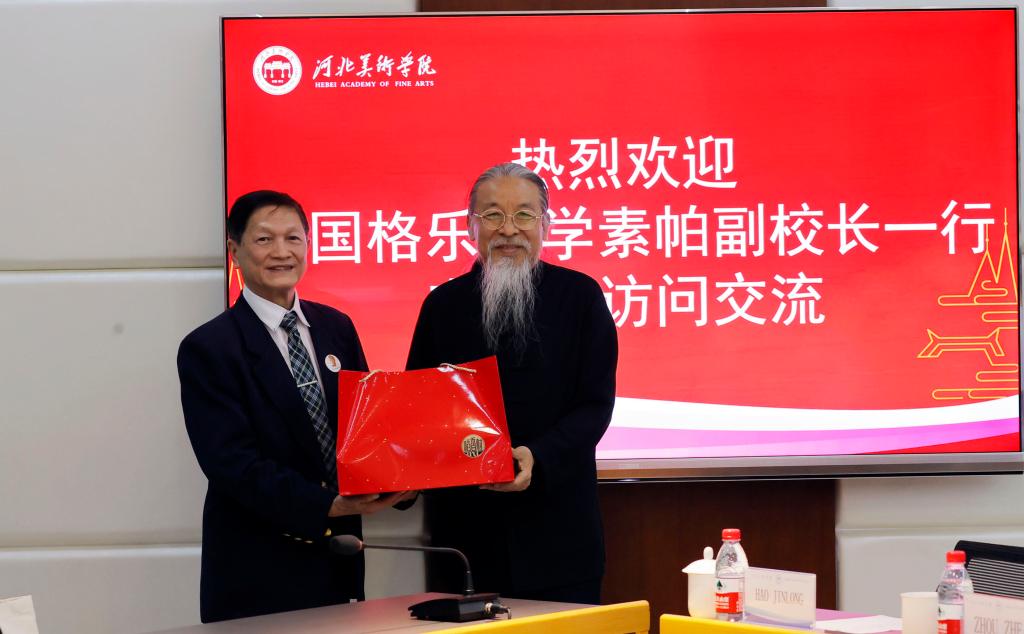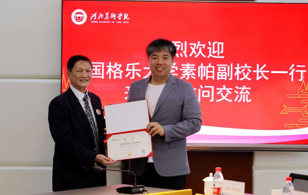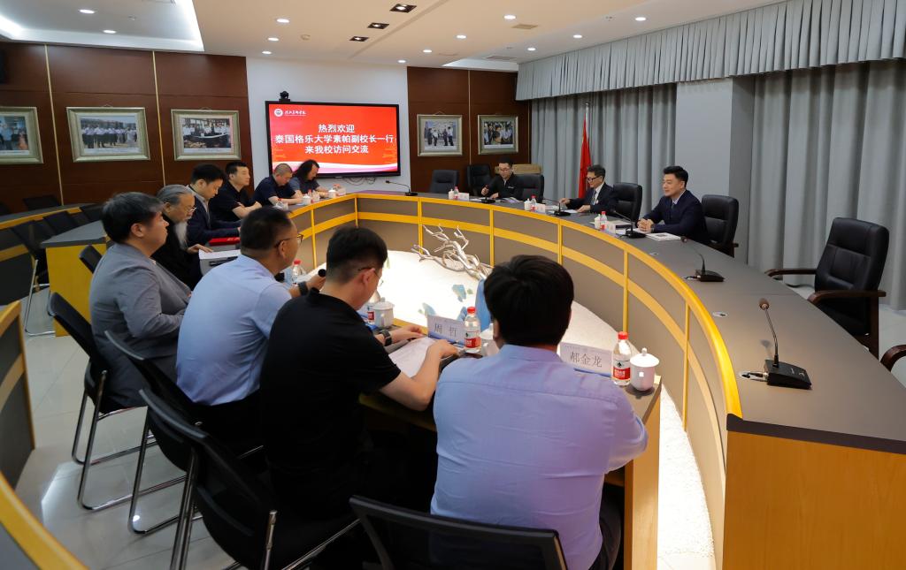 校长甄忠义对素帕一行的到来表示欢迎,并简要介绍了学校的办学理念及国际化办学水平,希望素帕一行对我校建设发展多提宝贵意见,携手并肩,共同发展。素帕简要介绍了泰国格乐大学的基本情况,希望双方在学科建设等方面加深合作,并诚邀我校到格乐大学指导交流。格乐大学国际学院院长谢森介绍了国际学院的基本情况及格乐大学的学科建设成就。