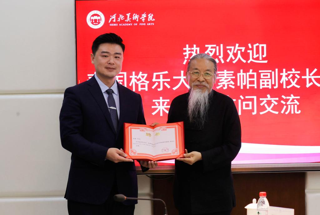 甄忠义为谢森颁发聘书;素帕为我校常务副校长张建敏颁发博士生导师聘书。