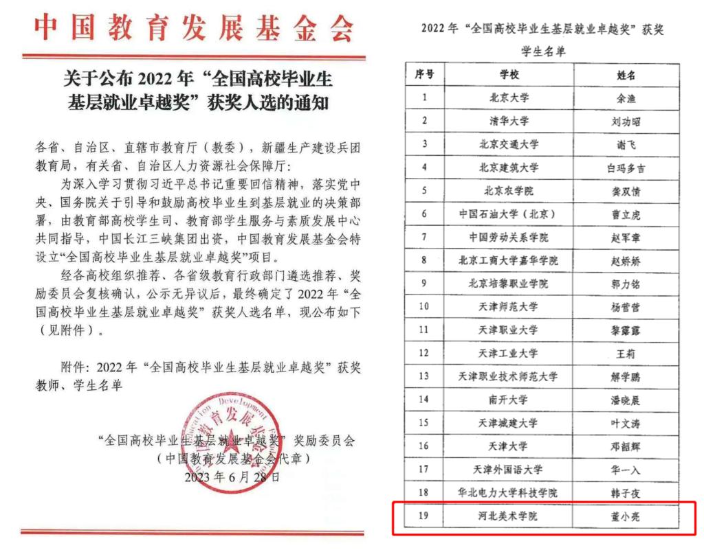 近日,中国教育发展基金会公布了2022年“全国高校毕业生基层就业卓越奖”获奖学生名单,我校校友董小亮入选。