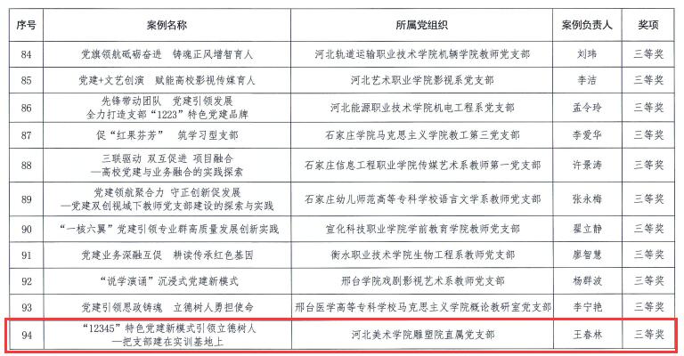 近日,河北省委教育工委公布高校党建工作典型案例评选结果(冀教党建函〔2023〕19号),我校雕塑院直属党支部申报的《“12345”特色党建新模式引领立德树人——把支部建在实训基地上》党建工作案例获评三等奖。