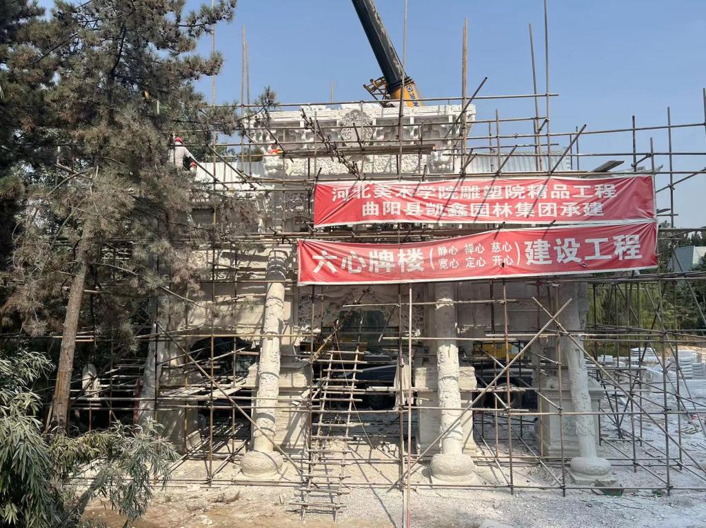 近日,由我校校长甄忠义统筹协调规划,雕塑院曾维林院长监制,雕塑院与曲阳县凯鑫雕塑集团有限公司携手共建的“六心牌楼”精品雕刻工程已经顺利完成主体安装的封顶。
