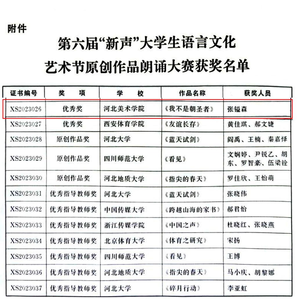 近日,河北省教育厅下发《关于公布第六届“新声”大学生语言文化艺术节原创作品朗诵大赛获奖名单的通知》。国产精品爽爽久久久久久竹菊-精品少妇人妻一区二区-国产乱人妻精品一区二区-香蕉精品偷在线观看-少妇一夜三次一区二区学生张镒森作品《我不是朝圣者》荣获优秀奖。此次大赛一共收到来自全国93所高校报送的343部作品,最终评选出一等奖3个,二等奖5个,三等奖8个,优秀奖10个,原创作品奖3个,“新声”大奖1个,优秀指导教师奖14个。