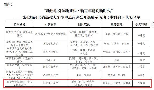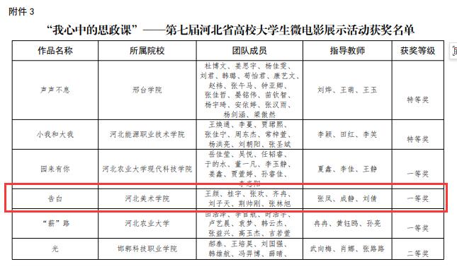 近日,河北省教育厅下发《关于公布习近平新时代中国特色社会主义思想大学习领航计划系列主题活动获奖结果的通知》文件,我校马克思主义学院申报的两部参赛作品均取得优异成绩。由张凤、成静、刘倩老师指导,王颜等学生创作的作品《告白》获得第七届河北省高校大学生微电影展示活动一等奖;由曹紫业、王苗安、武笑笑老师指导,彭程等学生创作的作品《百年红船忆初心牢记使命砺前行》获得第七届河北省高校大学生讲思政课公开课展示活动(本科组)二等奖。