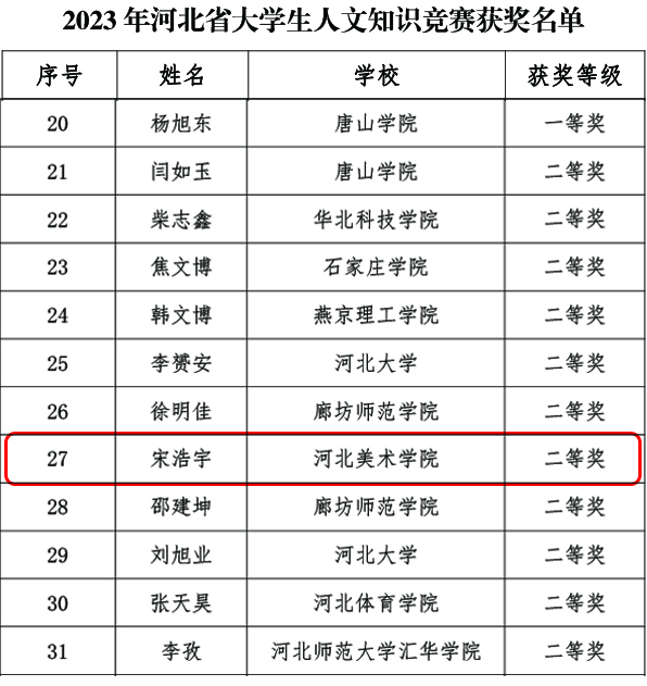 近日,华北五省市大学生人文知识竞赛河北赛区选拔赛在河北师范大学圆满落幕,我校20名学生代表参与此次竞赛,宋浩宇同学斩获二等奖,徐文武同学获得“视频单项奖”。