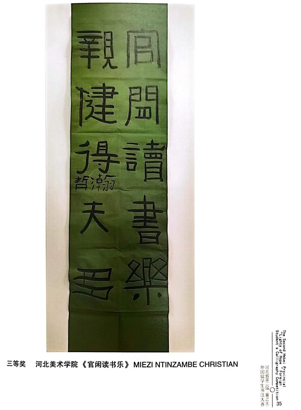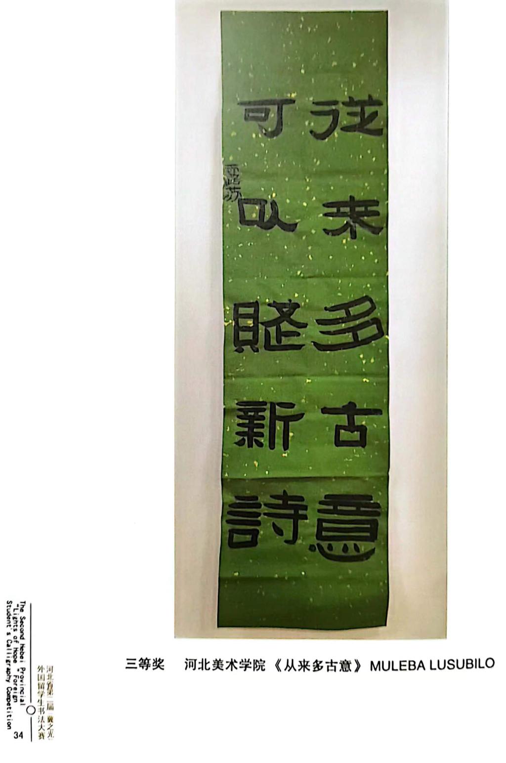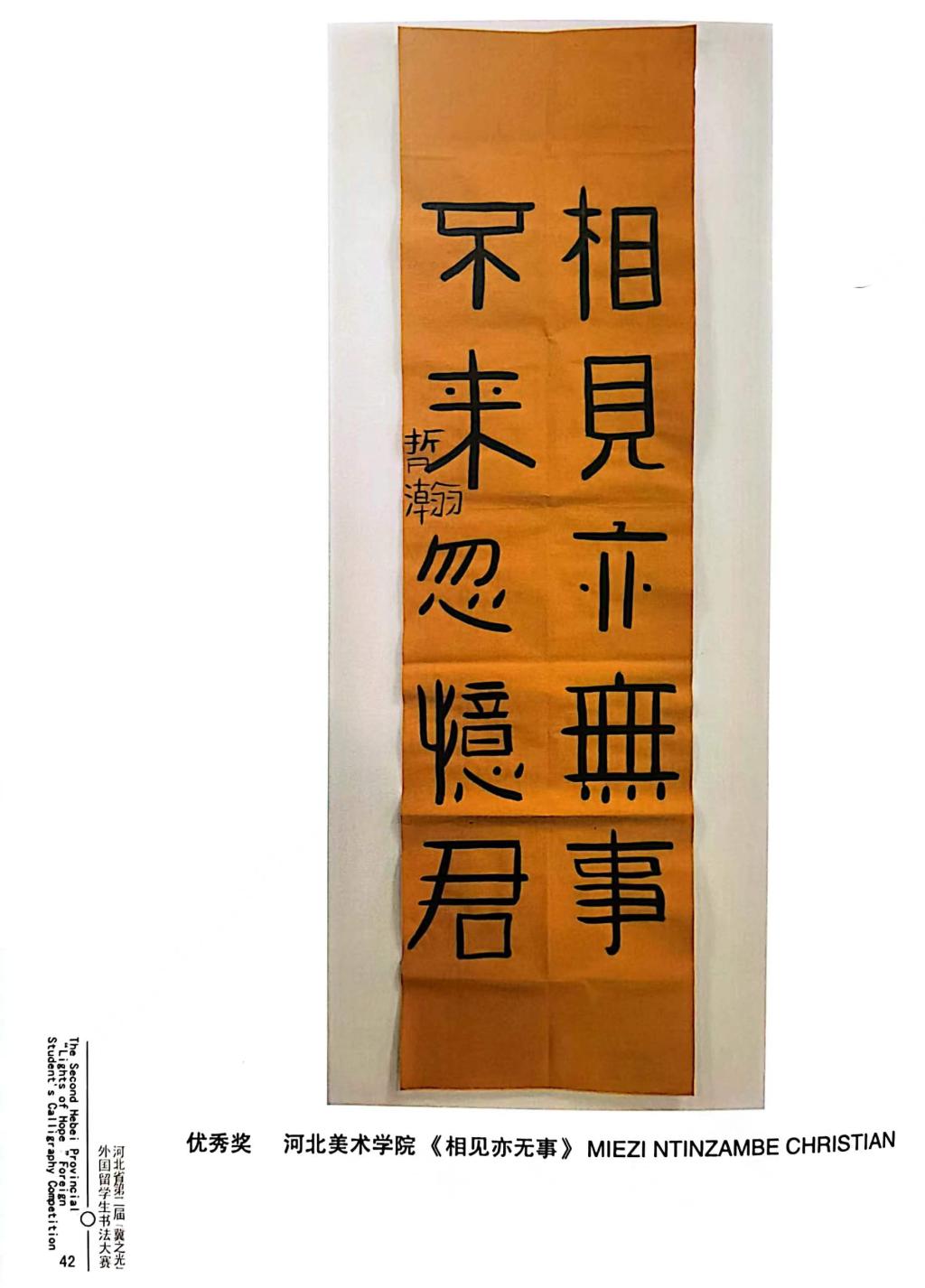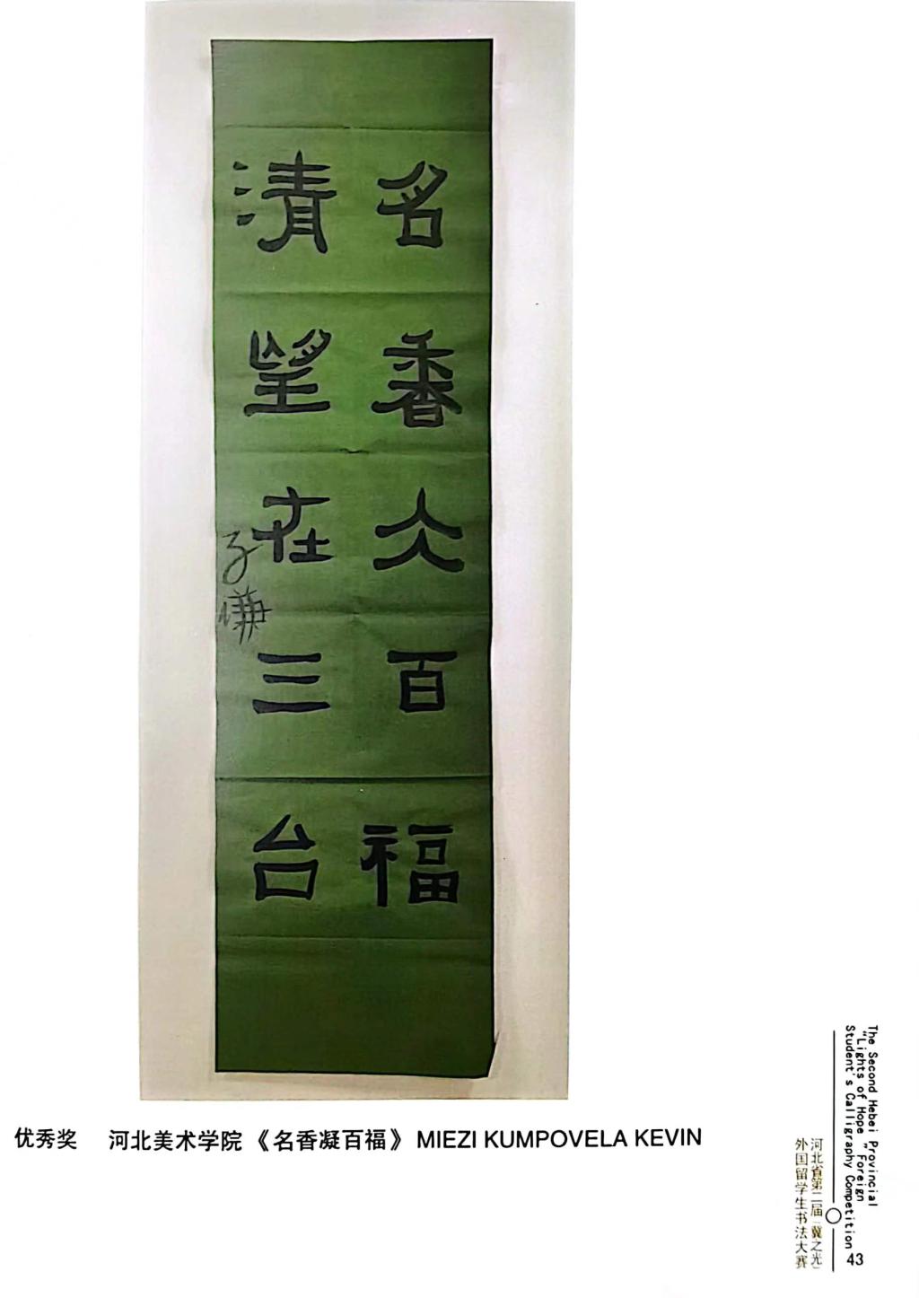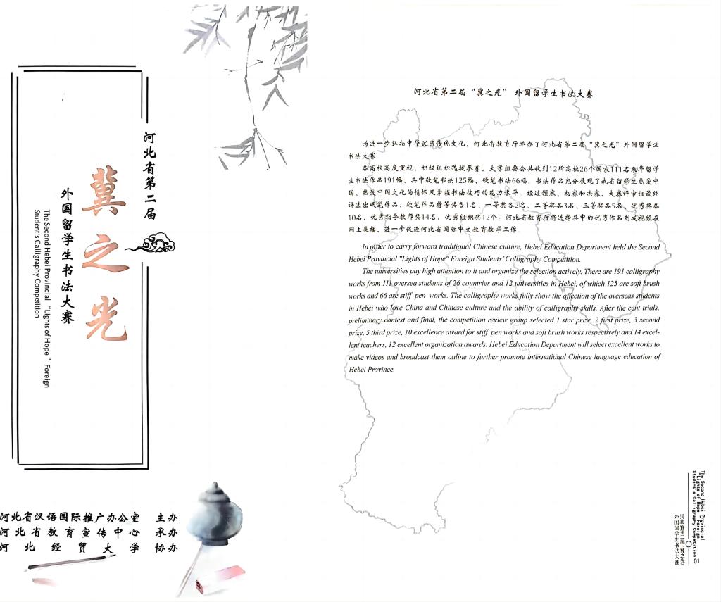 近日,由河北省教育厅主办,河北省教育宣传中心承办,河北经贸大学协办的河北省第二届“冀之光”外国留学生书法大赛获奖作品装订出版。我校留学生分别获得一等奖1个,二等奖1个,三等奖2个,优秀奖4个。