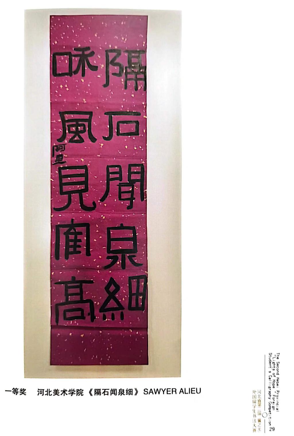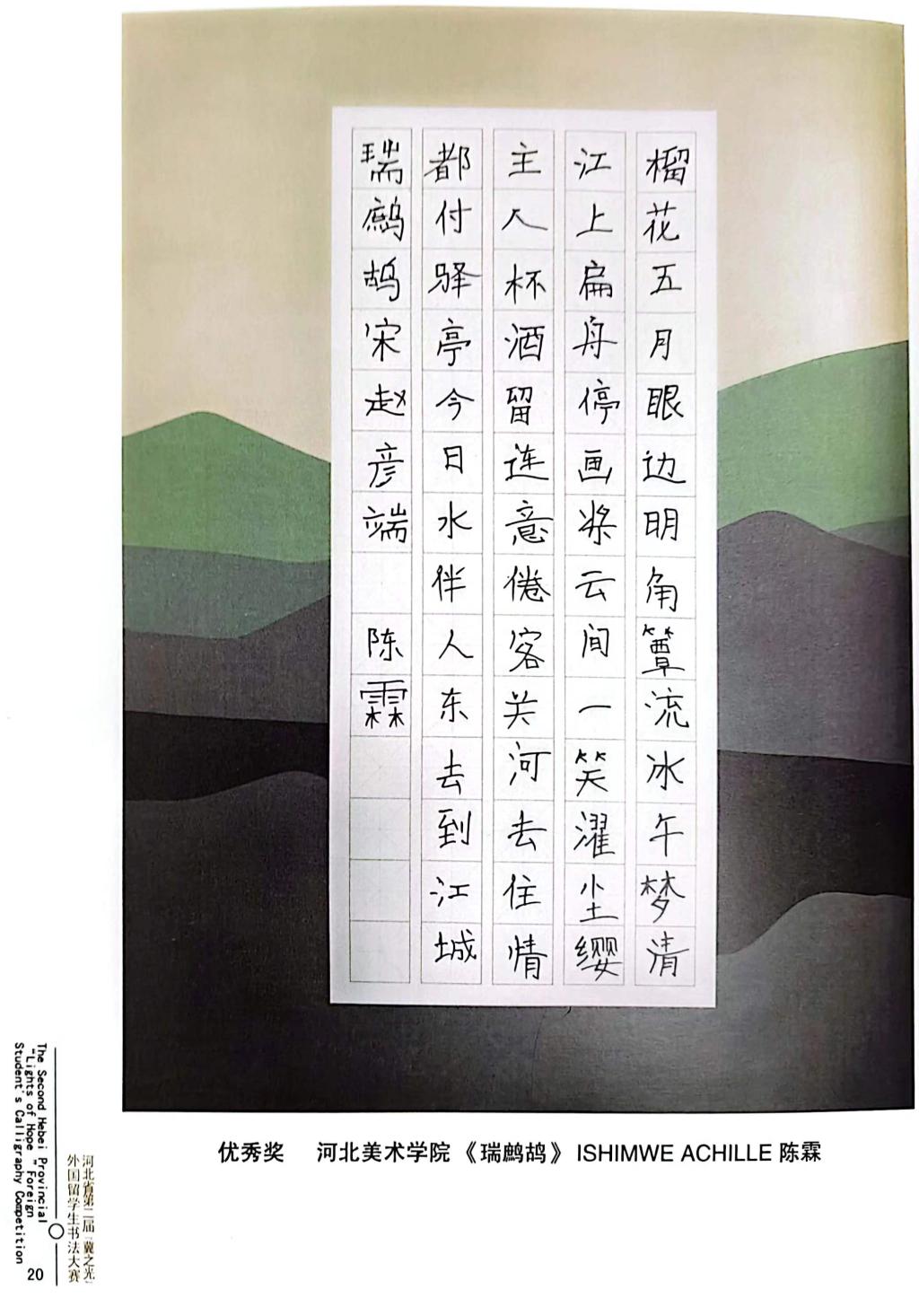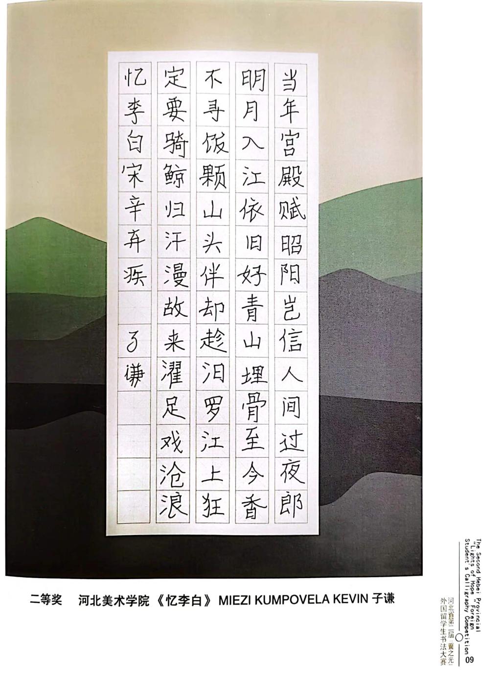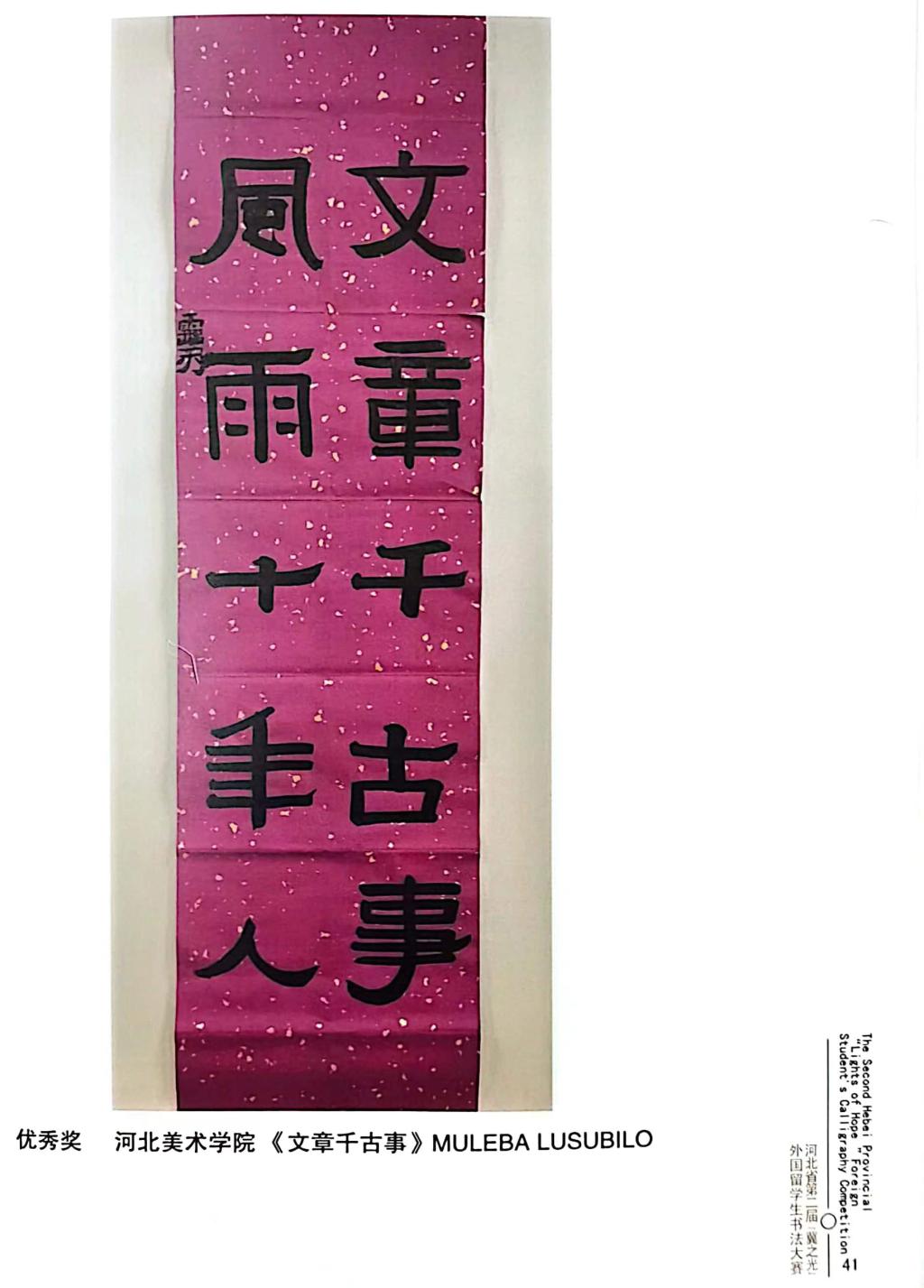 近日,由河北省教育厅主办,河北省教育宣传中心承办,河北经贸大学协办的河北省第二届“冀之光”外国留学生书法大赛获奖作品装订出版。我校留学生分别获得一等奖1个,二等奖1个,三等奖2个,优秀奖4个。
