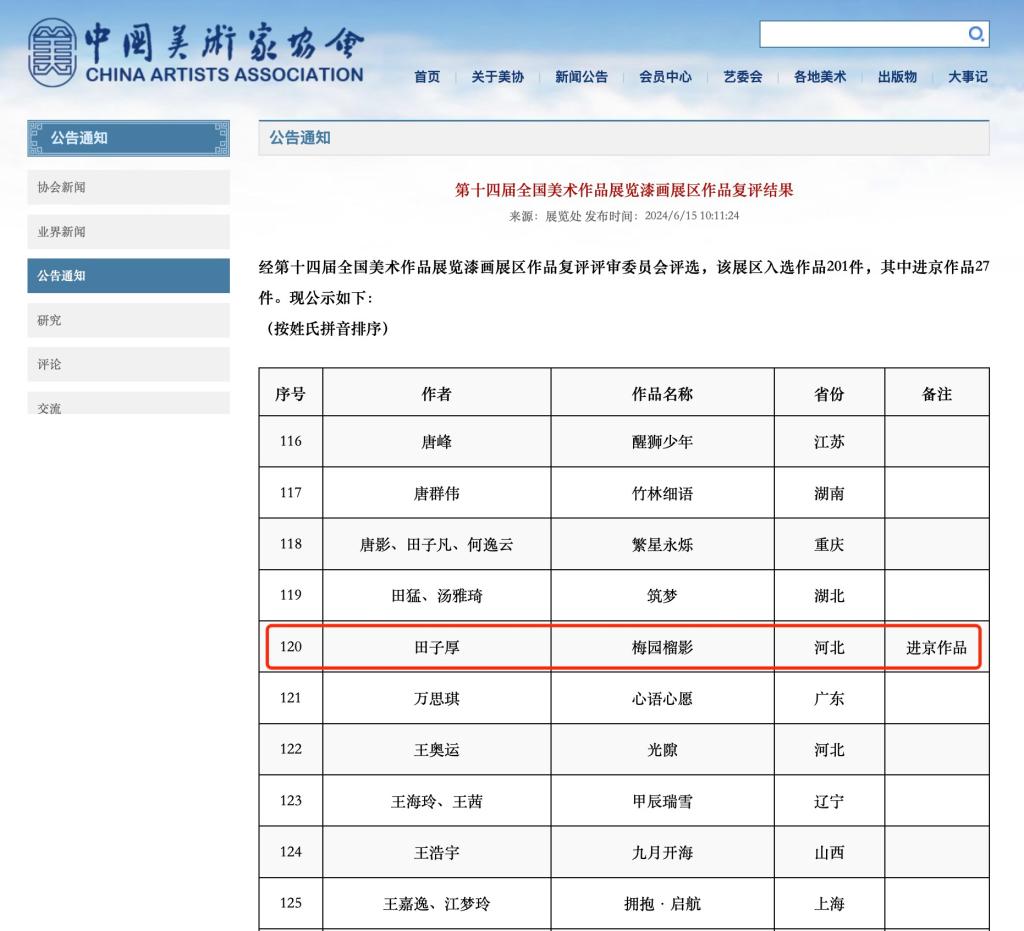6月15日,经第十四届全国美术作品展览漆画展区作品复评评审委员会评选,该展区入选作品201件,其中进京作品27件。我校教师田子厚的漆画作品《梅园榴影》入选本次展览并获“进京作品”展资格。