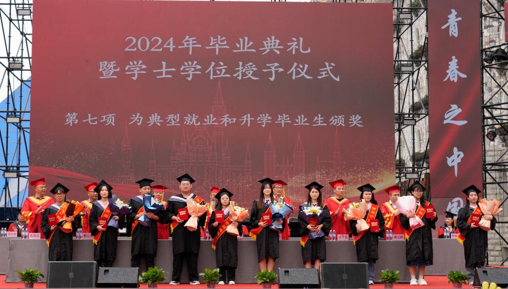 在典礼上,与会领导为就业、创业、升学代表毕业生颁发“就业之星”“基层就业之星”“考研之星”“创业之星”荣誉证书。