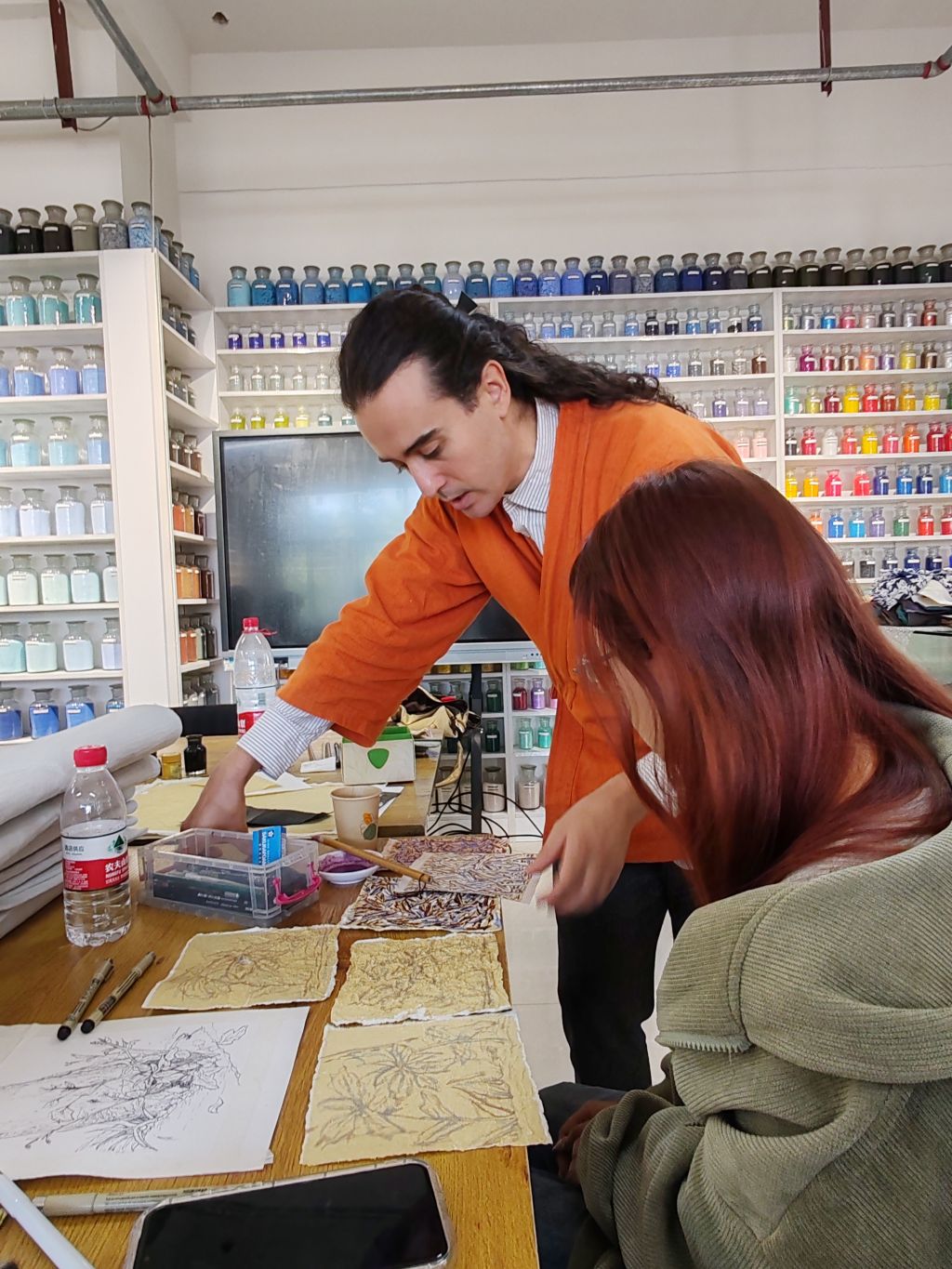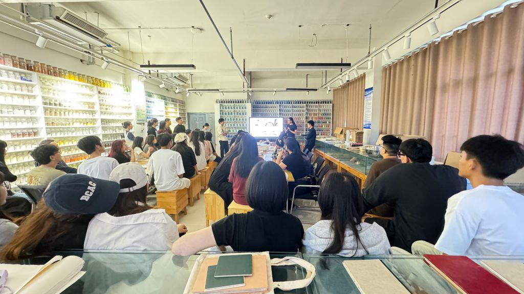 在课堂上,安河老师分享了自己基于手工纸张所创作的当代作品,以及在多个国家主创的在地壁画项目。他生动的讲述和趣味的示范,让学生们体验了制作矿物颜料、纸本书和艺术创作的乐趣。不仅提高了学生们的动手能力,也让他们对材料的选择和使用有了更深刻的理解。