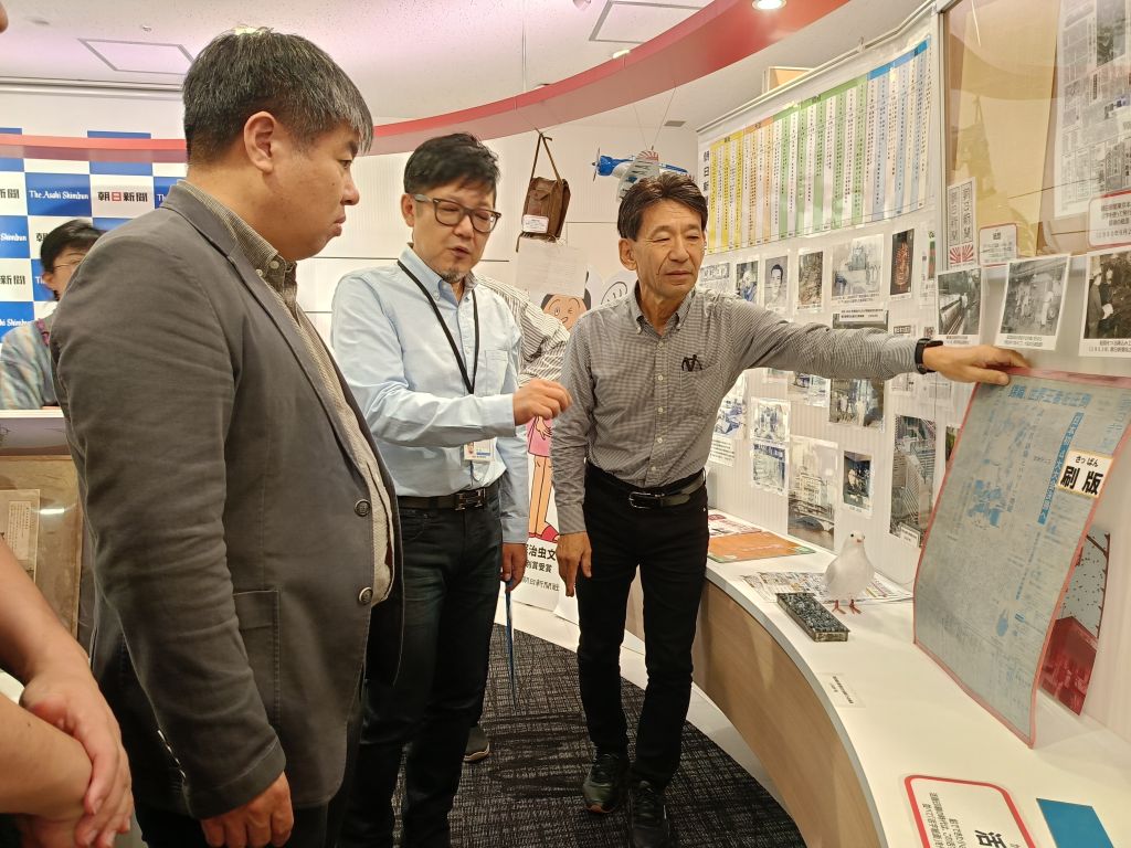 朝日新闻总部商务中心读者服务组经理安井克之(右一)讲解发展历程