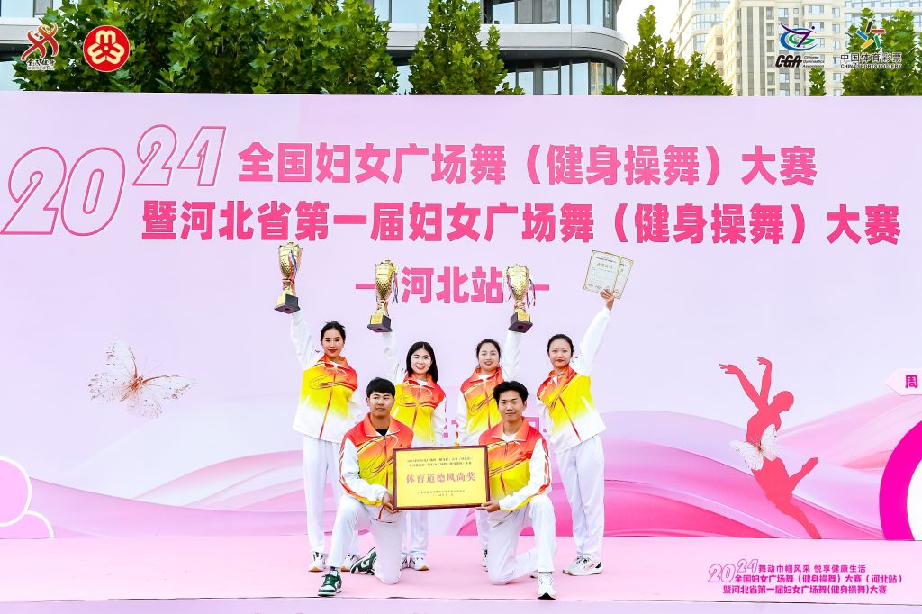 近日,国家体育总局、全国妇联主办的2024年全国妇女广场舞(健身操舞) 大赛(河北站)暨河北省第一届妇女广场舞(健身操舞)大赛在石家庄顺利举办,此次比赛涵盖河北全省、辐射京津冀三地,同时联动山东、广东等部分省份160支队伍参赛,参赛总人数近 2500人。我校体育教师团队参加大赛并斩获自选套路(青年组)特等奖、规定套路(青年组)二等奖、团体二等奖以及荣获体育道德风尚奖。