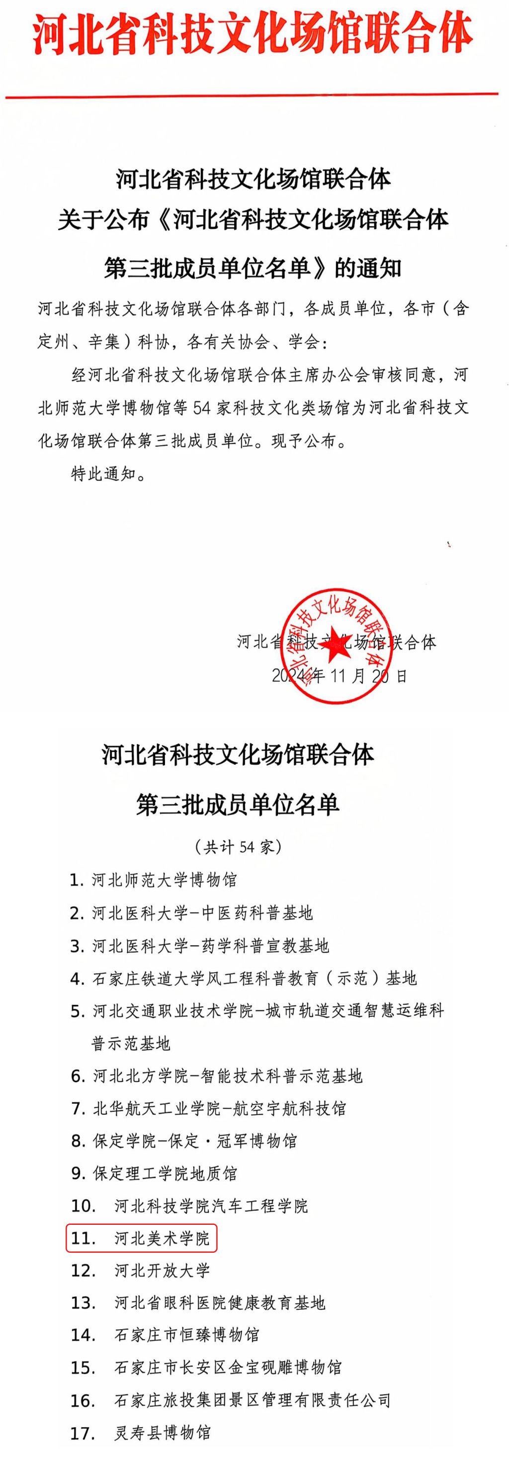 近日,河北省科技文化场馆联合体发布了第三批成员名单,我校被批准成为该联合体的第三批成员单位。