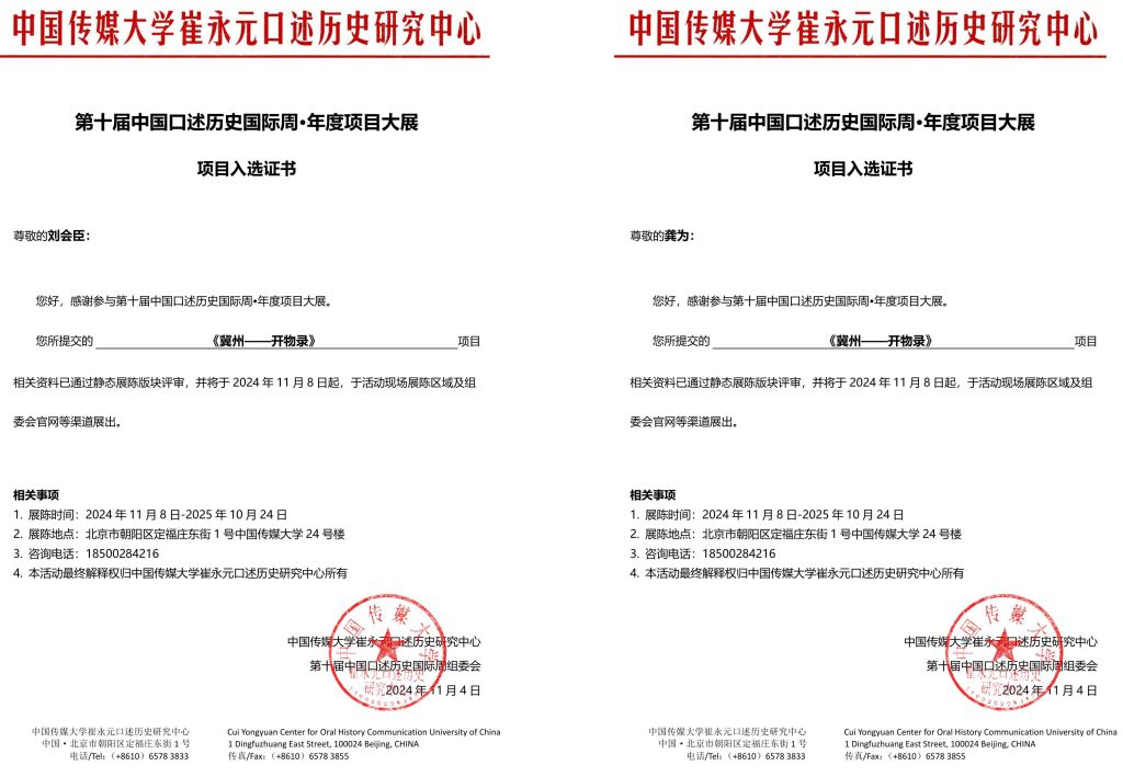 11月11日,由我校影视艺术学院教师主导完成的《手机纪录片——冀州·开物录》口述历史项目成功入选由中国传媒大学发起并主办的第十届中国口述历史国际周。该项目由我校影视艺术学院党委书记、院长王峰,影视与制作教研室主任刘会臣、外聘教授龚为共同完成。